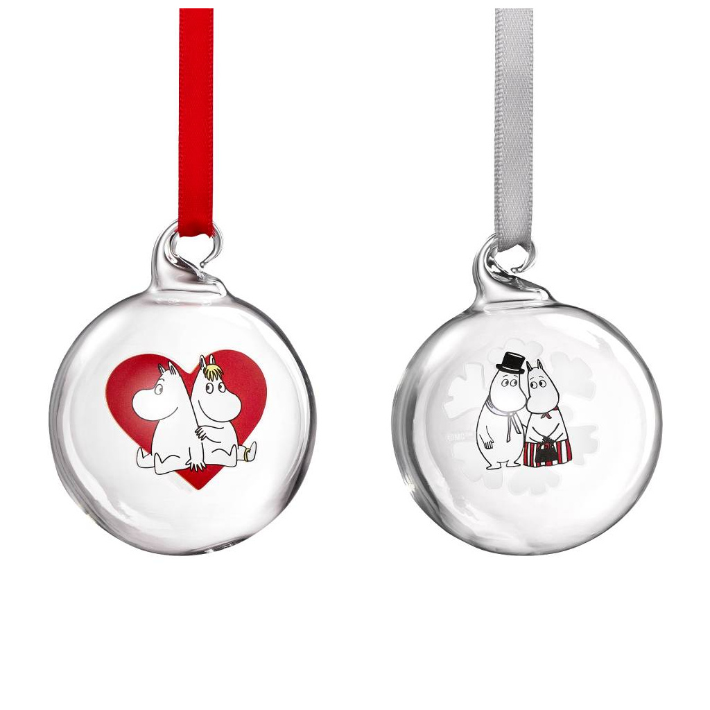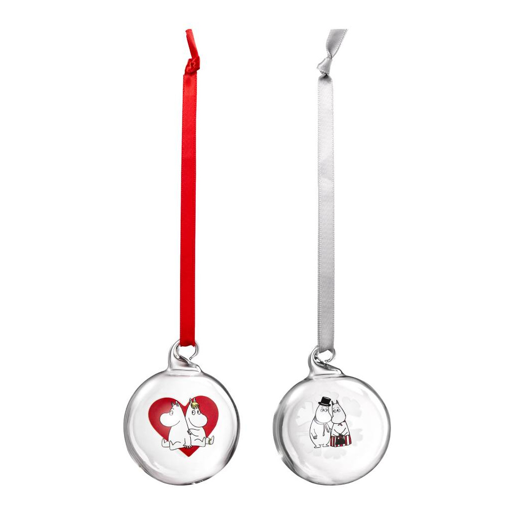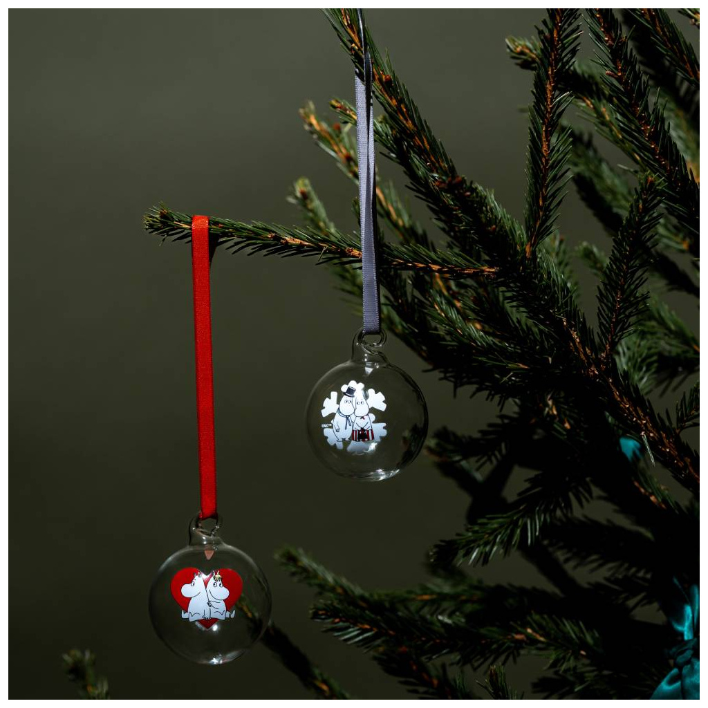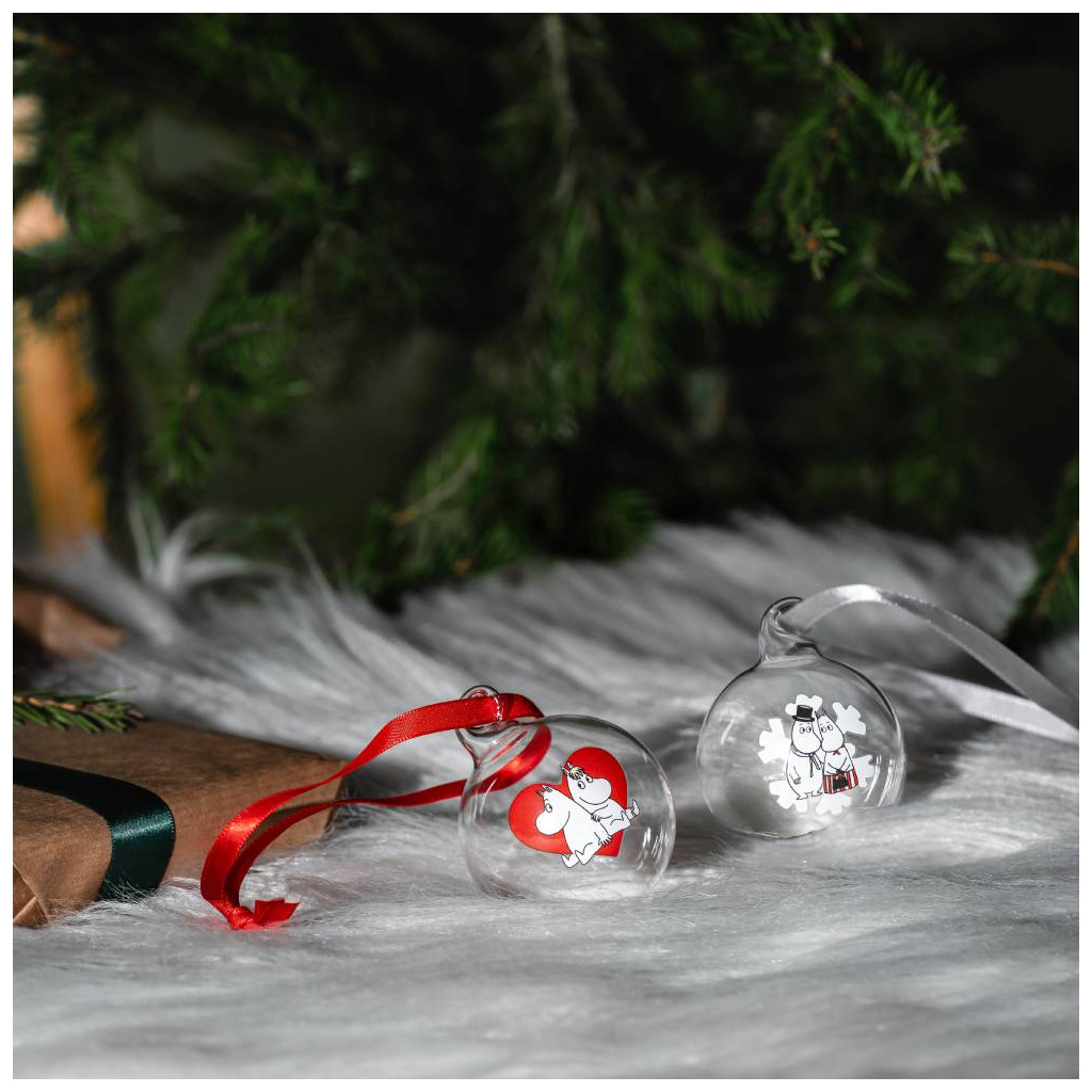 Decorate your home with a pinch of Moominvalley's Christmas magic! The Moomin glass baubles are perfect for hanging from the Christmas tree or in the window. Moomin decoration baubles with diameter of 5 cm, set of 2 pcs. Satin ribbon included. Hand made from glass.