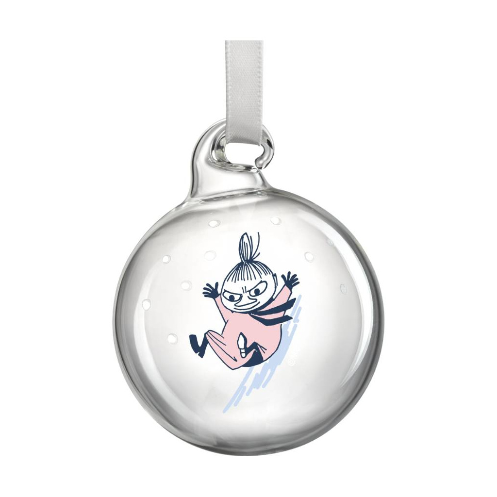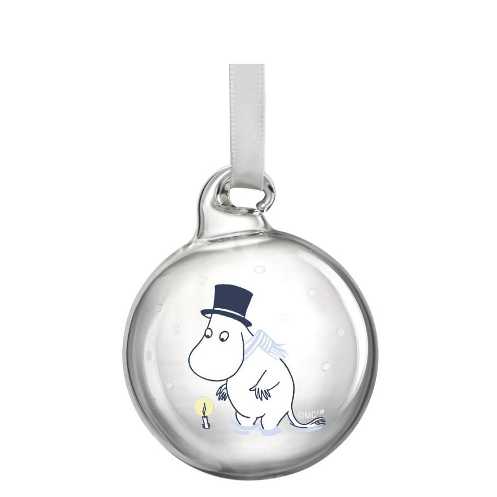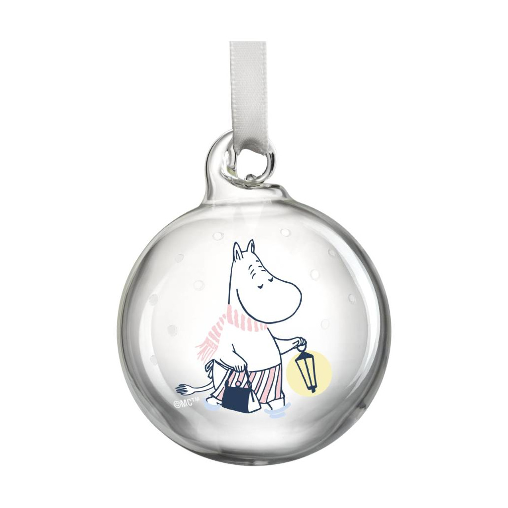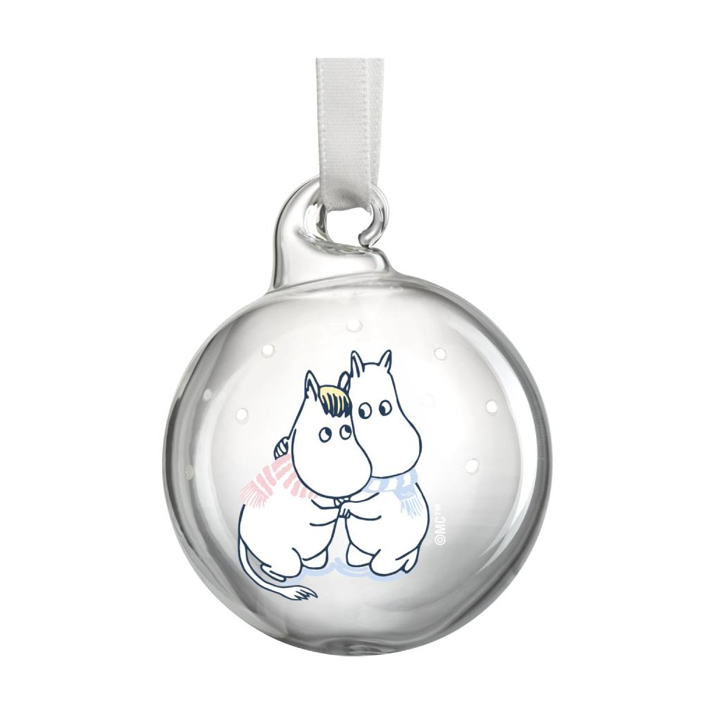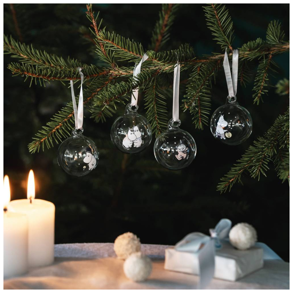 Create a cozy feeling of Christmas and winter with these Moomin themed glass balls. Each piece comes with a satin ribbon. Mouth-blown from lead-free glass. Size Ø 5 cm.