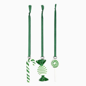 This charming set includes three candy-shaped ornaments, each carefully crafted from glass and suspended by elegant red satin ribbons.
