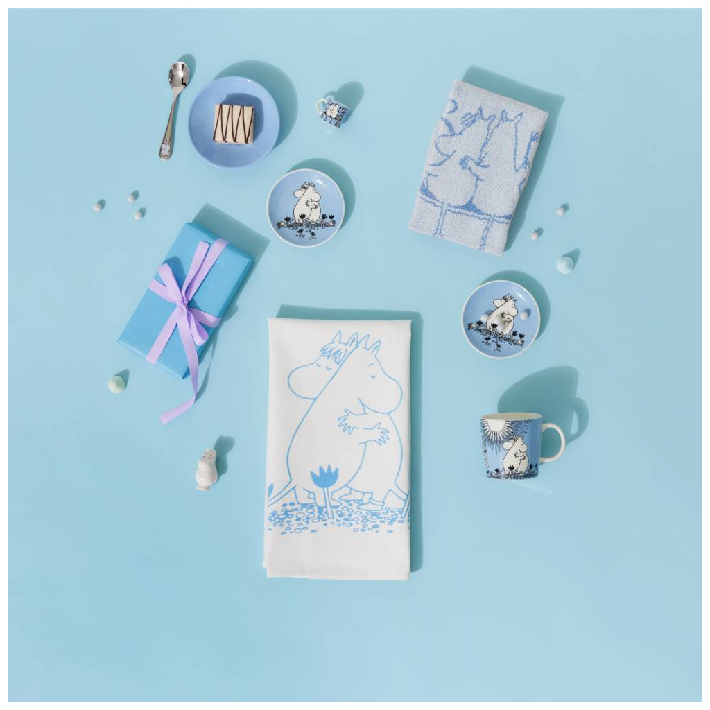Jasnoniebieski kubek Love Muminki z kolekcji Moomin Classics przedstawia, Muminka i Migotkę przytulających się do siebie. Oboje lubią się bawić i spędzać razem czas, ale ich związek jest romantyczny.