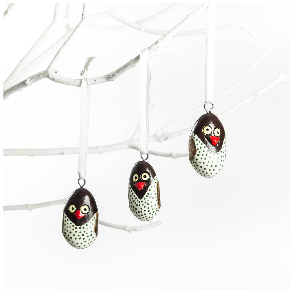 Our painted bird and animal ornaments are carved by hand out of fallen jacaranda tree branches and surplus wood. They are made in Nicodemus and Cecilia’s Fair Trade workshop in the outskirts of Nairobi, Kenya. Nicodemus and Cecilia have a small family workshop specializing in wood carving, and Mifuko has been collaborating with them since 2010. All the artisans have been trained by Nicodemus’ parents, thus passing on the handicraft tradition to a younger generation. The entire process of carving, sanding and painting is done by hand by talented artisans. While the branches are still soft, they are cut and carved into birds and then dried before sanding. The delicate wooden birds are then painted meticulously with water-based acrylic colors. Once painted, each bird gets six coats of clear varnish with time to dry between each application. Each bird takes several hours to finish, and each is unique.