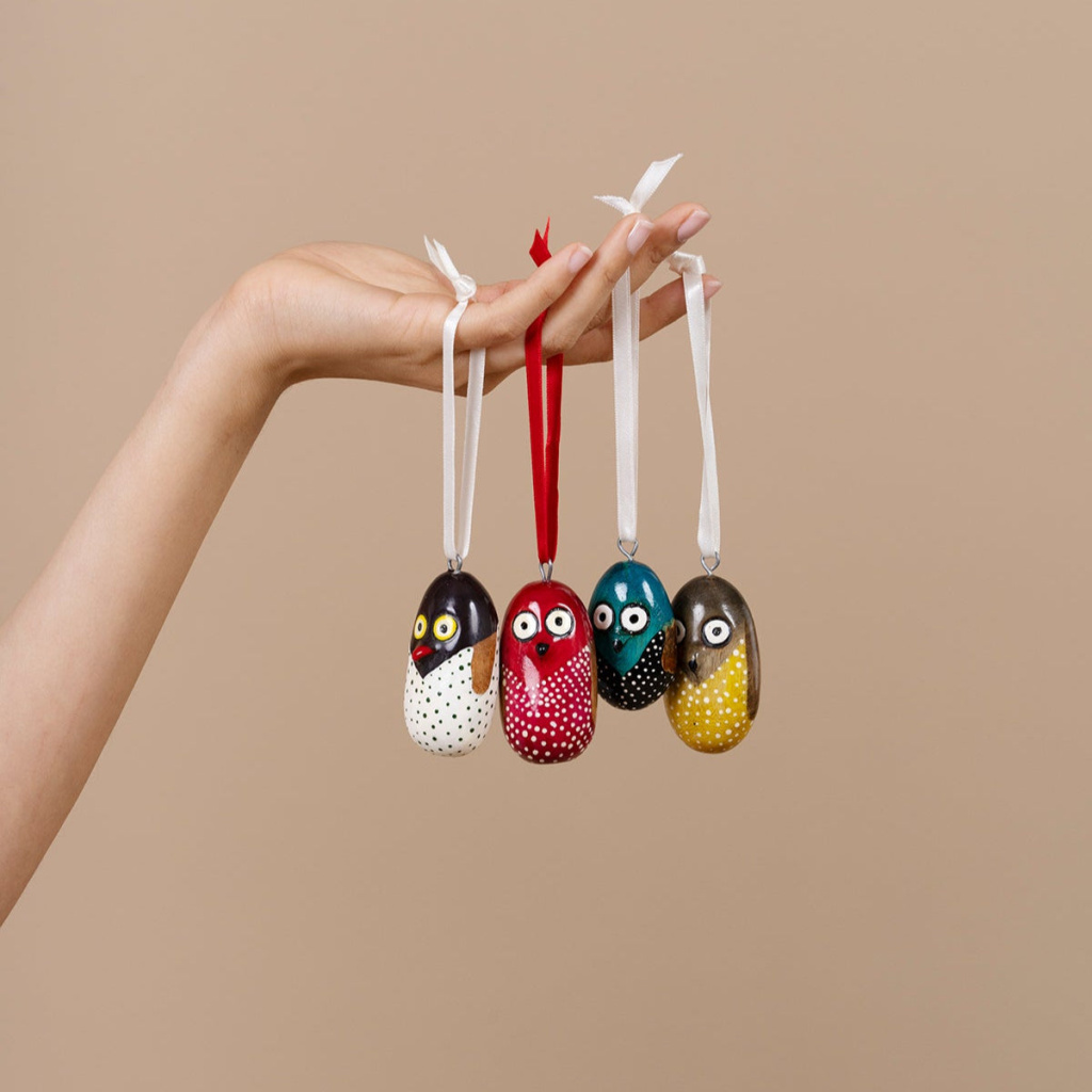 Te urocze ozdoby wykonane są z opadłych gałęzi jakarandy, ręcznie rzeźbione i malowane, aby nadać im niepowtarzalny charakter. Zawieś je na ozdobnych gałęziach, drzwiach, oknach lub choinkach. Możesz je również wykorzystać jako breloczki do kluczy lub do ozdabiania toreb i torebek.