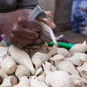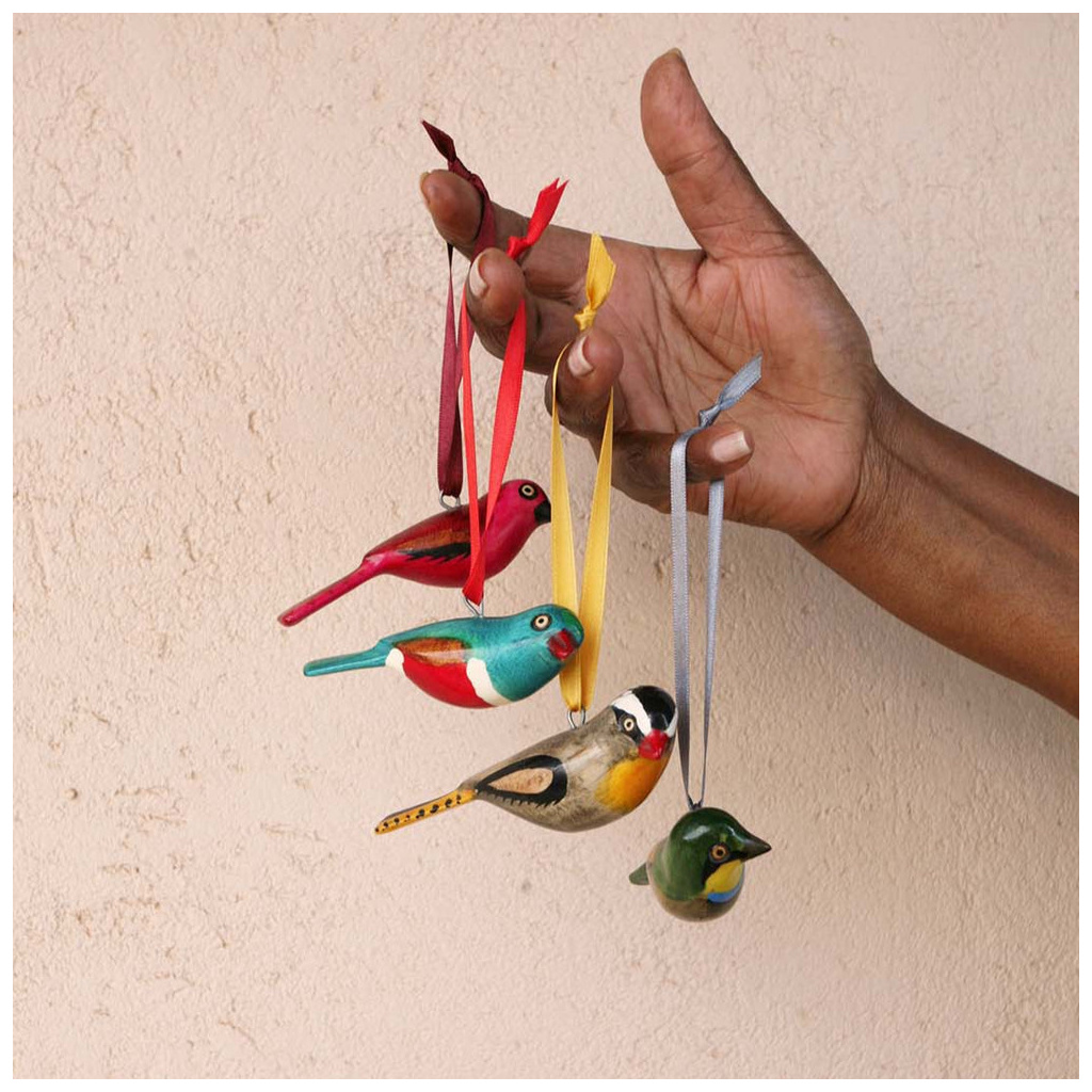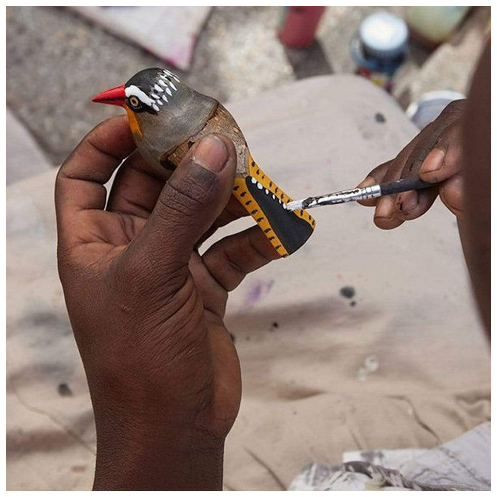Our painted bird and animal ornaments are carved by hand out of fallen jacaranda tree branches and surplus wood. They are made in Nicodemus and Cecilia’s Fair Trade workshop in the outskirts of Nairobi, Kenya. Nicodemus and Cecilia have a small family workshop specializing in wood carving, and Mifuko has been collaborating with them since 2010. All the artisans have been trained by Nicodemus’ parents, thus passing on the handicraft tradition to a younger generation. The entire process of carving, sanding and painting is done by hand by talented artisans. While the branches are still soft, they are cut and carved into birds and then dried before sanding. The delicate wooden birds are then painted meticulously with water-based acrylic colors. Once painted, each bird gets six coats of clear varnish with time to dry between each application. Each bird takes several hours to finish, and each is unique.