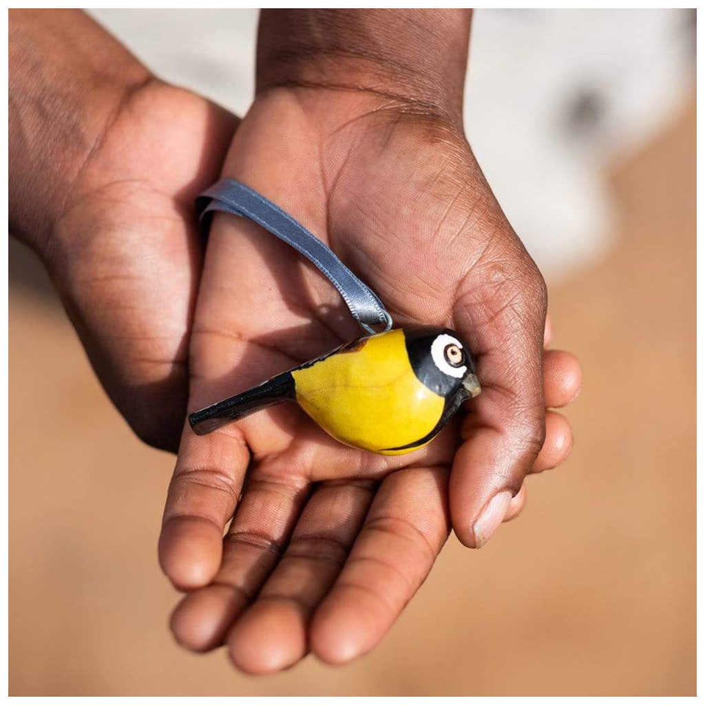 Our painted bird and animal ornaments are carved by hand out of fallen jacaranda tree branches and surplus wood. They are made in Nicodemus and Cecilia’s Fair Trade workshop in the outskirts of Nairobi, Kenya. Nicodemus and Cecilia have a small family workshop specializing in wood carving, and Mifuko has been collaborating with them since 2010. All the artisans have been trained by Nicodemus’ parents, thus passing on the handicraft tradition to a younger generation. The entire process of carving, sanding and painting is done by hand by talented artisans. While the branches are still soft, they are cut and carved into birds and then dried before sanding. The delicate wooden birds are then painted meticulously with water-based acrylic colors. Once painted, each bird gets six coats of clear varnish with time to dry between each application. Each bird takes several hours to finish, and each is unique.