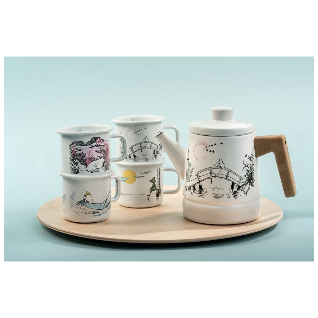 White enamel mug with Snufkin dreaming. Cheer up your coffee and tea moments! Muurla combines design and durability in this beautiful Moomin enamel mug. They are suitable not only for traditional table setting but also for any kind of outdoor use - including hiking, cottage and boat. Volume 3.7dl. Machine washable.
