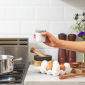 Na górnej powierzchni minutnika znajduje się również nakłuwacz do jajek. Nakłucie zapobiega pękaniu jajka podczas gotowania oraz pomaga przy obieraniu go ze skorupki.