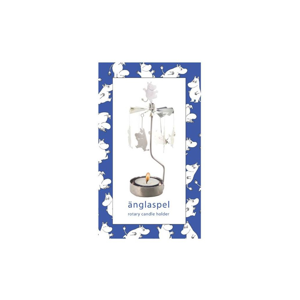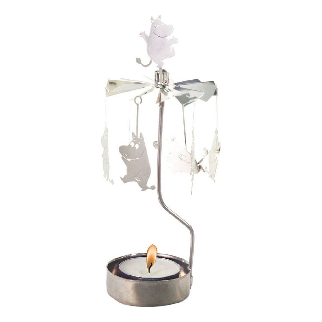 This Rotary candleholder with the Moomintroll awakens remembrances of childhood! The top of the holder spins with the heat of a lit candle. Pluto's designs are typically Scandinavian in style and combine traditional shapes and thinking with a new modern look. Material: Silver coloured metal. Tea light is included and packaged in an attractive box. Size: 16.5 x 6.5 cm.