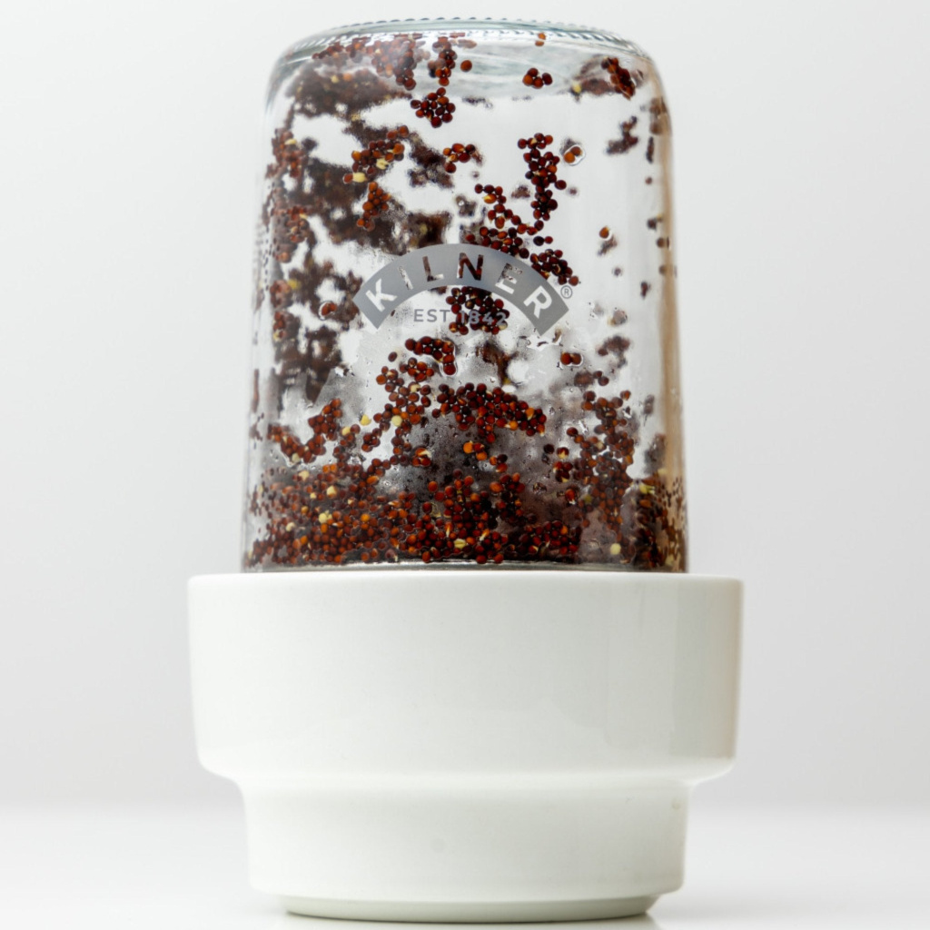 3. Kiełkowanie: Wymieszaj delikatnie nasiona, a następnie ustaw słoik na ceramicznej podstawce pod lekkim kątem, aby zapewnić odpływ nadmiaru wody i cyrkulację powietrza. Płucz i odcedzaj nasiona 2–3 razy dziennie, każdorazowo dokładnie je odsączając.