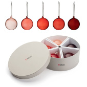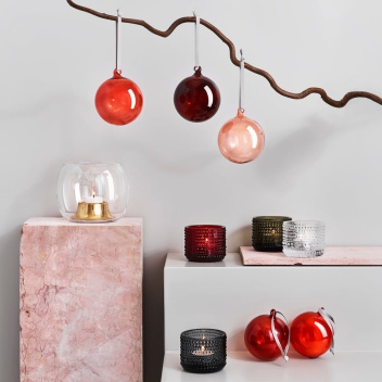 Komplet szklanych bombek RED GLASS BALL 5 SET. Create new holiday traditions with Iittala’s 5 pc red glass ball set. Each delicate ornament is mouthblown and comes with grey textile ribbons to hang them on the Christmas tree. From the palest pink to the richest red, each glass ornament reflects its own unique warm light, creating pure holiday harmony. Wrapped in an elegant round hatbox, the ornament set makes a generously lovely gift.