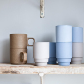 The Siebring & Zoetmulder collective created a series of uniquely shaped stackable ceramic cups in soft shades of misty grey blue and cobalt. For the shape of the cups, the designers played with architectural proportions inspired by the mathematical rules of the ‘Golden Ratio’ and the geometric elements used by the Memphis group.
