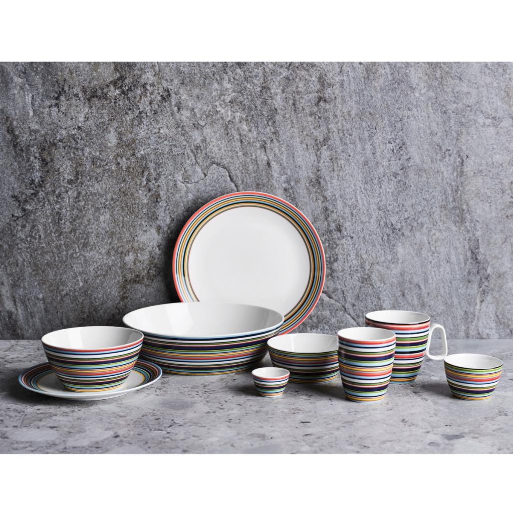 Origo's bold striped pattern adds a colorful accent to any table, and its pieces combine perfectly with other Iittala tableware to bring ambiance and upscale sophistication to any meal. Origo's timeless style and infinitely combinable form is a perfect example of lasting, functional design that transcends trends.