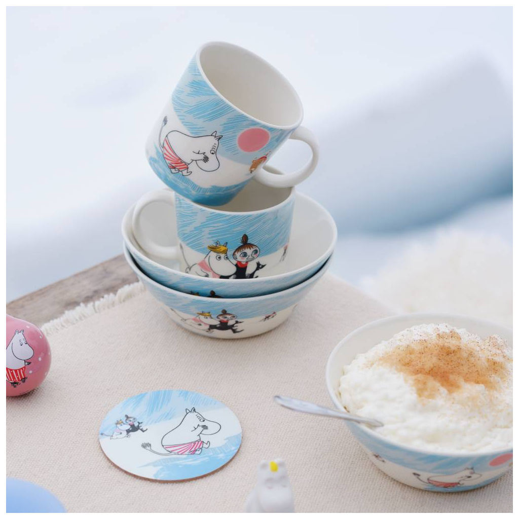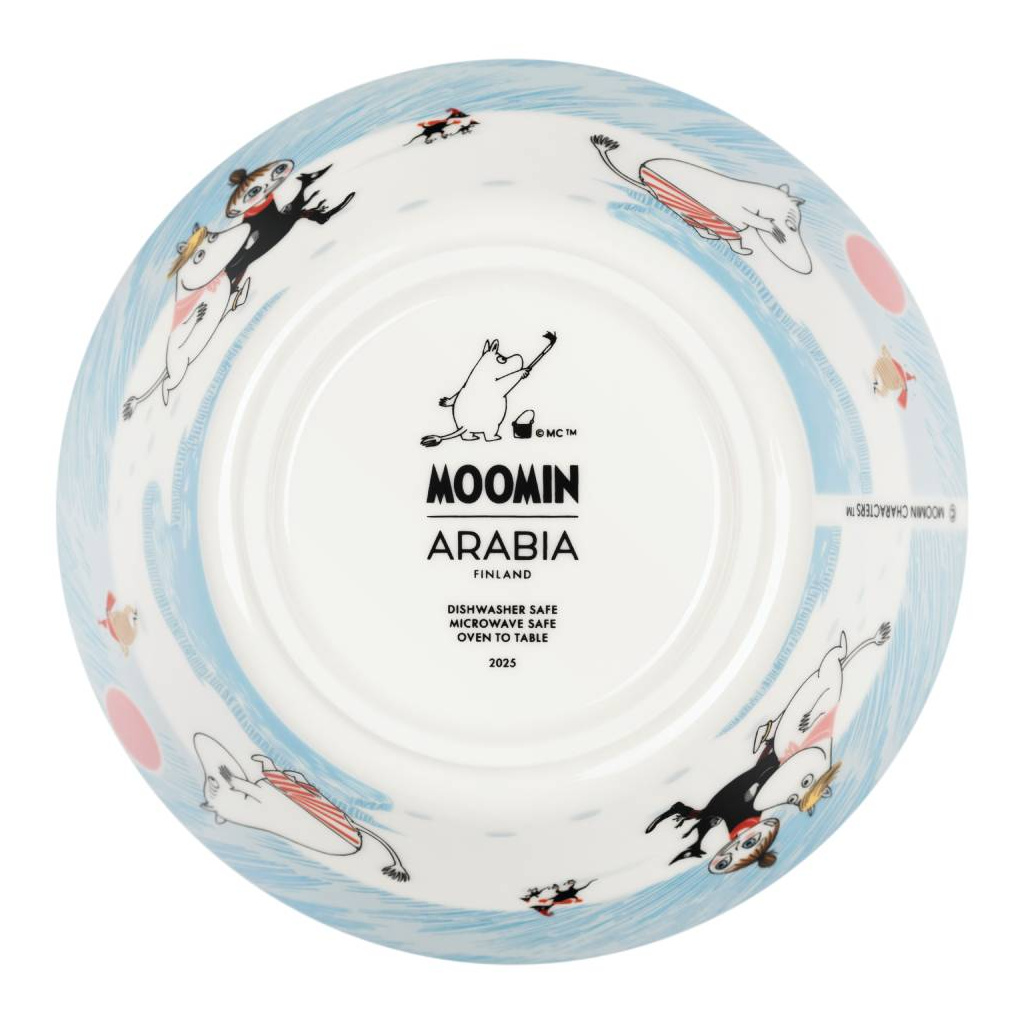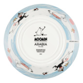 Beautiful light blue Moomin Arabia bowl 15cm, Ice swimming. Material: vitroporcelain. Machine washable, oven and microwave safe. Designed in Finland. Made in Thailand.