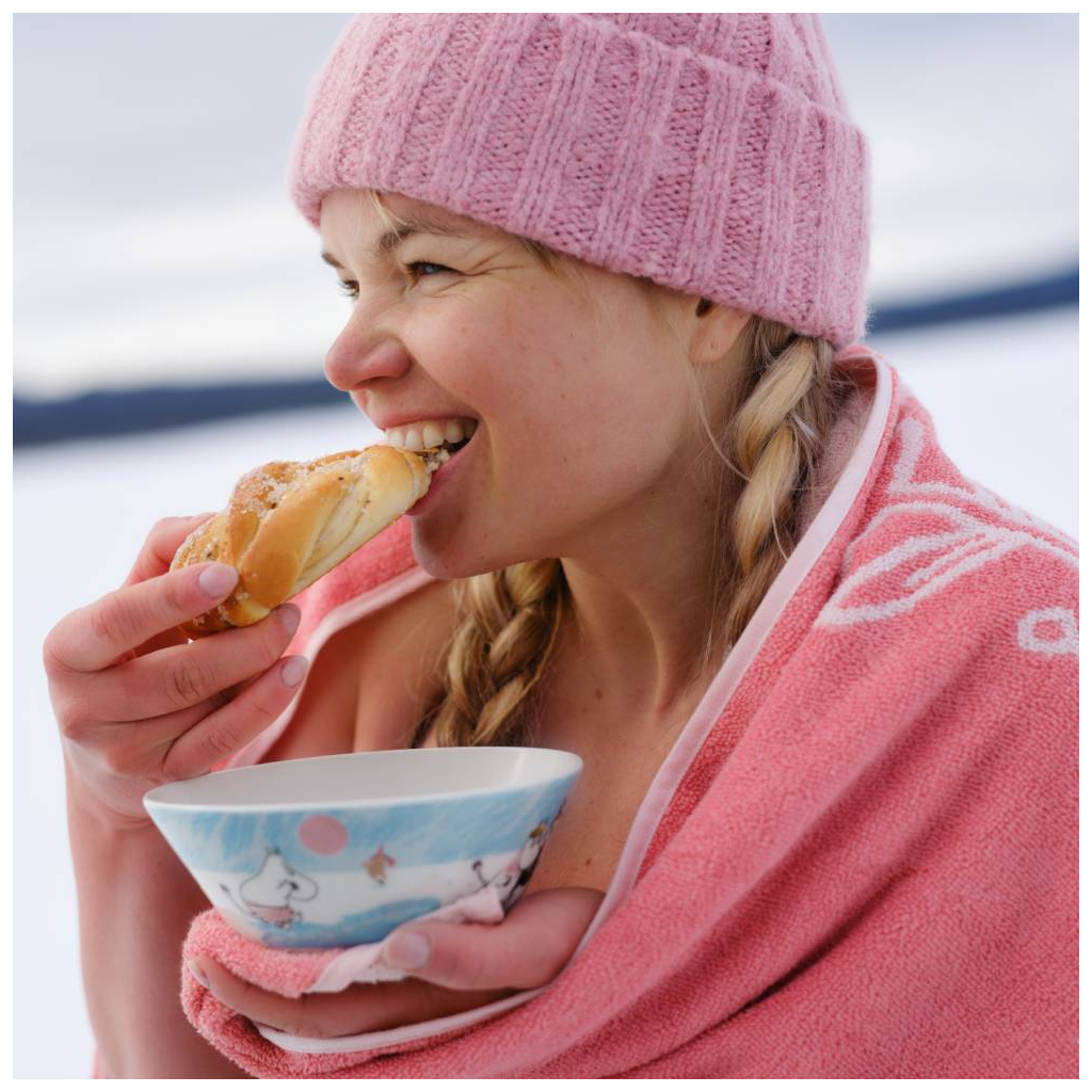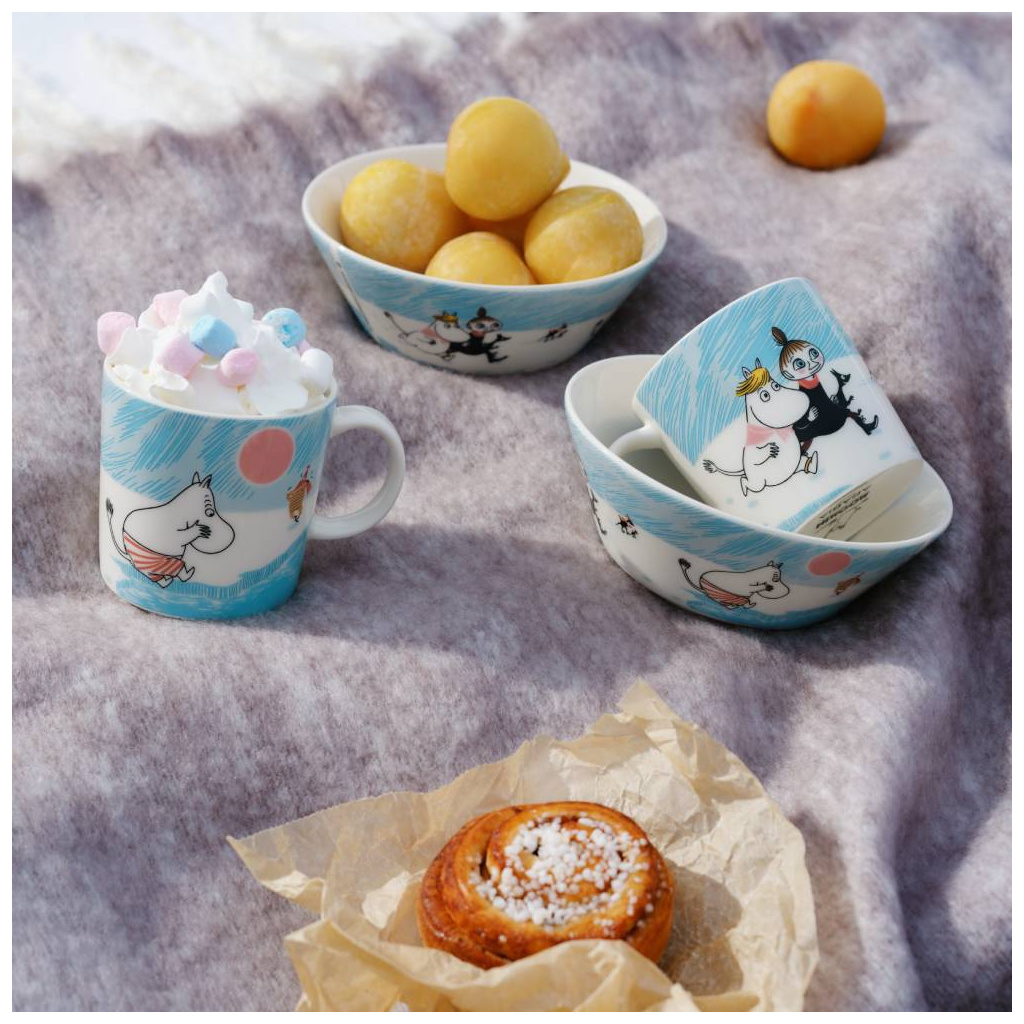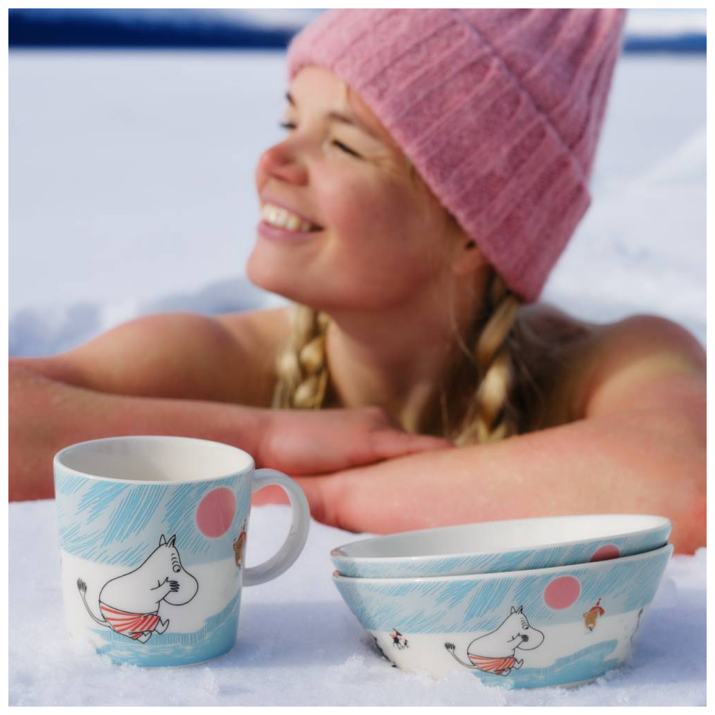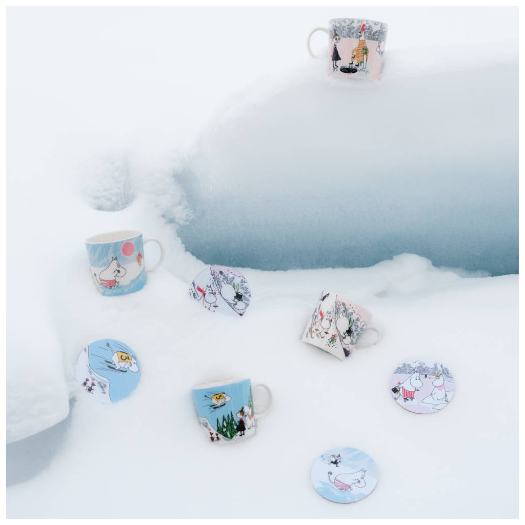 Mr Brisk’s secret to staying fit and healthy is ice dipping. Mymble and Snorkmaiden are charmed by his sporty spirit. Unfazed, Moomintroll dives into the icy water, eager to win their admiration. The 2025 Winter Seasonal Collection Ice swimming is the final ode to Moomin’s winter sports adventures.