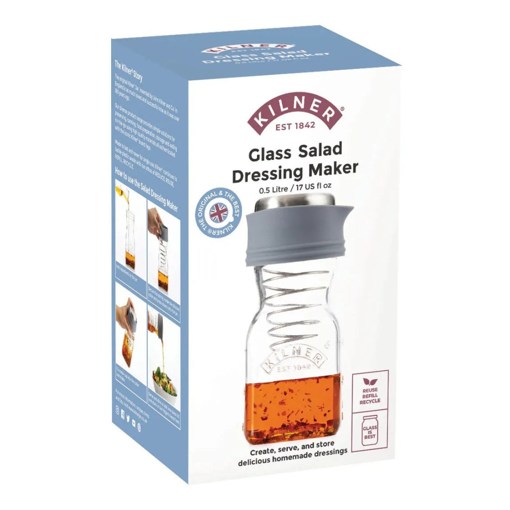 Szklany słoik marki Kilner to elegancki i praktyczny produkt przeznaczony do przygotowywania domowych dressingów do sałatek. Wykonany z wysokiej jakości, przezroczystego szkła, słoik jest trwały i łatwy do utrzymania w czystości.