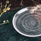 Finnish design legend Oiva Toikka was experimenting with ways to conceal joint marks in glass when he created the groundbreaking raised glass droplet design of Kastehelmi. Made to resemble strings of dewdrops glistening in the morning sun, Kastehelmi plays with light, bringing out the true reflective beauty of the glass. Iittala’s beloved Kastehelmi collection offers a wide range of versatile pieces that are both functional and decorative. Delicate yet durable dinnerware, the Kastehelmi 248mm plate is perfect for serving main entrees. Clear glass showcases food beautifully. The simple, stunning design suits any table setting. Collect a set. Great wedding, anniversary or housewarming gift. Dishwasher safe.