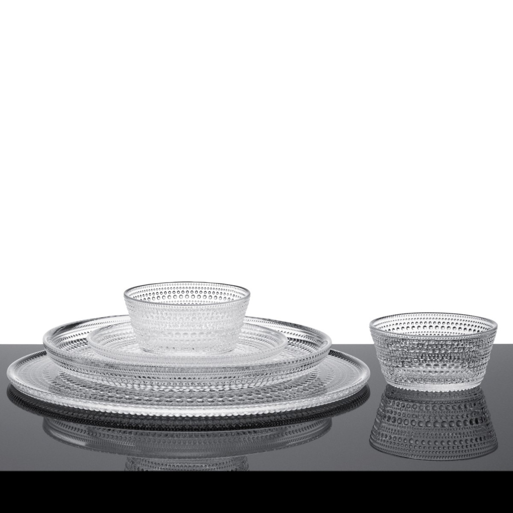 Szklany talerz obiadowy o średnicy 24,8 cm, dostępny w trzech kolorach. Talerz przezroczysty. Projektant: Oiva Toikka. Producent: Iittala. Źródło photo: Iittala, Finlandia.