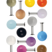 With its distinctive spherical head, the DOTS wall hook is a modern classic. Whether solo or in colourful combination, it makes a great highlight. The FAVORITES, FRESH, ICECREAM, JODHPUR, MARRAKECH and PALM SPRINGS sets each consist of five different-coloured hooks with fully lacquered heads. These create an interesting contrast with the brushed stainless steel or PVD-coating of the spacer rods and wall plates. In JODHPUR the rod and disc are PVD-coated in matt black, with MARRAKECH in brushed brass, and with PALM SPRINGS in brushed copper. The hooks are also available individually, in a choice of colours, or crafted from oak or walnut with an oiled, natural finish. Particularly eye-catching are the DOTS STONE hooks, with their heads of polished marble. Garments can be hung with or without hangers, or hooked onto the additional, small coat hook, which is finished to match the spacer and disc. DOTS wall hooks can be used anywhere, whether for space-saving coat storage in hallways at home, in kitchens, kids’ rooms and dressing rooms, or in offices, waiting rooms or hotels. A single idea with countless options – the essence of good, timeless design.