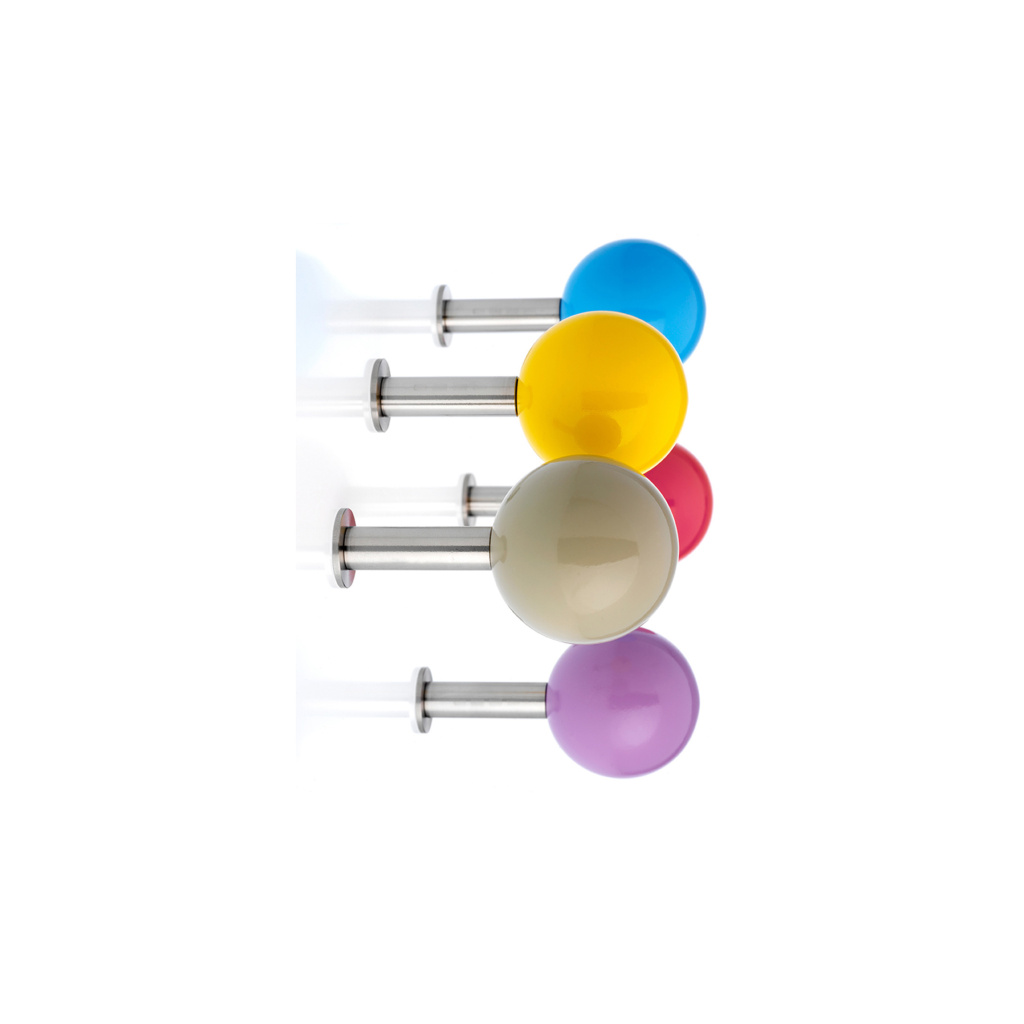 FAVORITES to 5 ściennych wieszaków w formie kolorowych kulek. Wieszaki wyprodukowano z litego drewna i powleczono kilkoma warstwami połyskliwego kolorowego lakieru. Zestaw zawiera kulki mocowane na prętach ze stali szczotkowanej w kolorach: yellow, pink, safari, lilac i sky. Wymiary: 5x9 cm. Projekt: Design Apartment 8. Źródło photo: Schoenbuch, Niemcy.