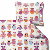 Dziecięca delikatna duńska pościel w sowy z przeznaczeniem do małych łóżeczek. Wersja w kolorystyce różowej. Materiał: 100% organiczna bawełna, w dotyku satynowa.