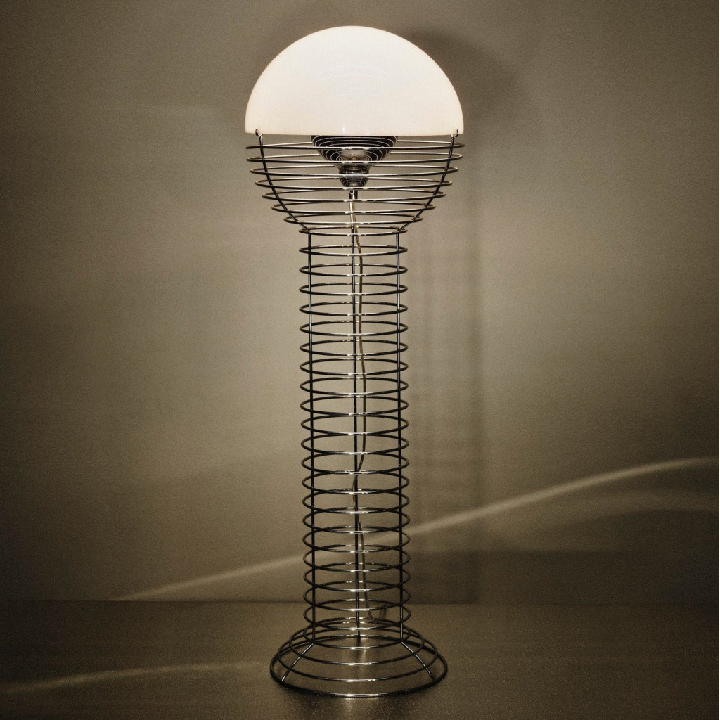 The decorative Wire floor lamp is defined by the chrome-plated steel wire framework that widens at the top to support the white hemispherical plastic shade.