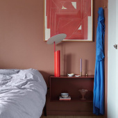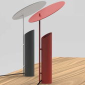 All parts manufactured in steel. Powder coated red or grey. Grey variant; vertical rod in satin finish. The down facing surface of disc shade powder coated white for optimal light reflection.