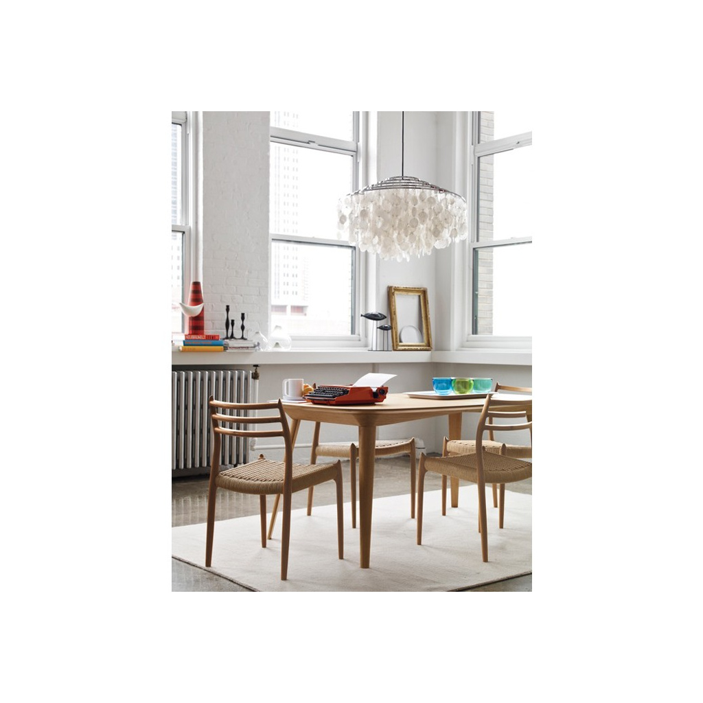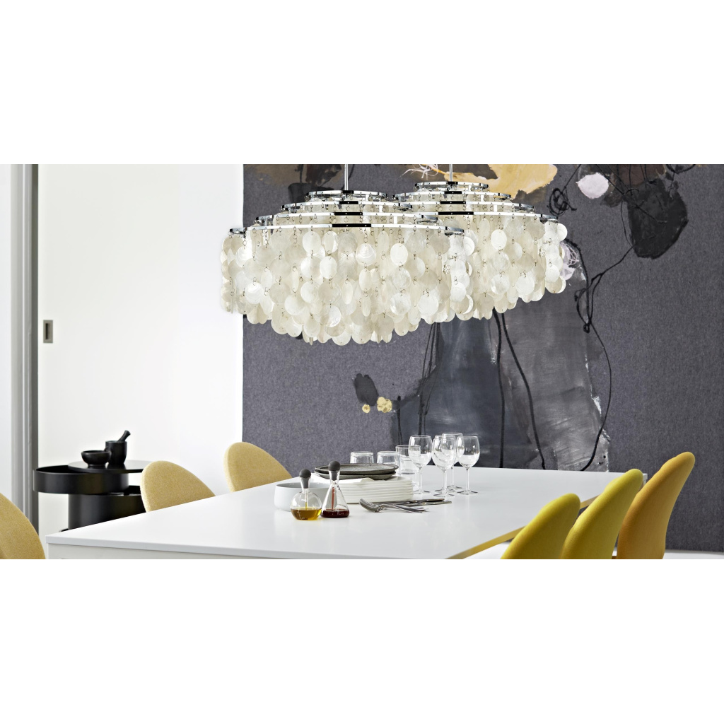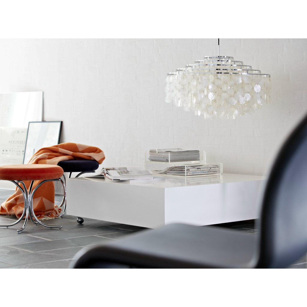 Verner Panton would use the world around him for inspiration, combining materials that would express a great experience in the small details. Fun is the best example of the greatness of detail. Mother of Pearl is reminiscent of the sea, beach, sun, light, sound, sand, of nature's own solution, combined with the creativity of Panton for functionality. The result is a lamp where you can feel and hear the world light. The large scale Fun Pendant was created to be seen and heard. It deserves much more than a corner and a remote spot in your room. Use it as a prominent and inspiring part of your interior design.