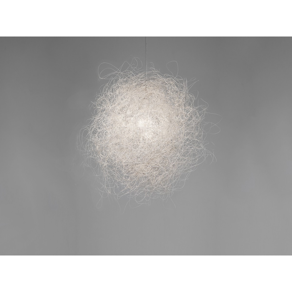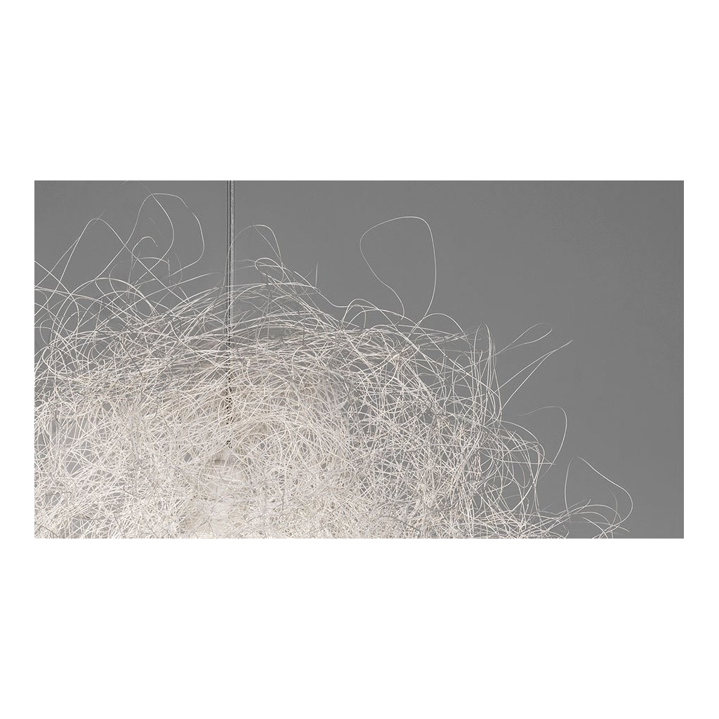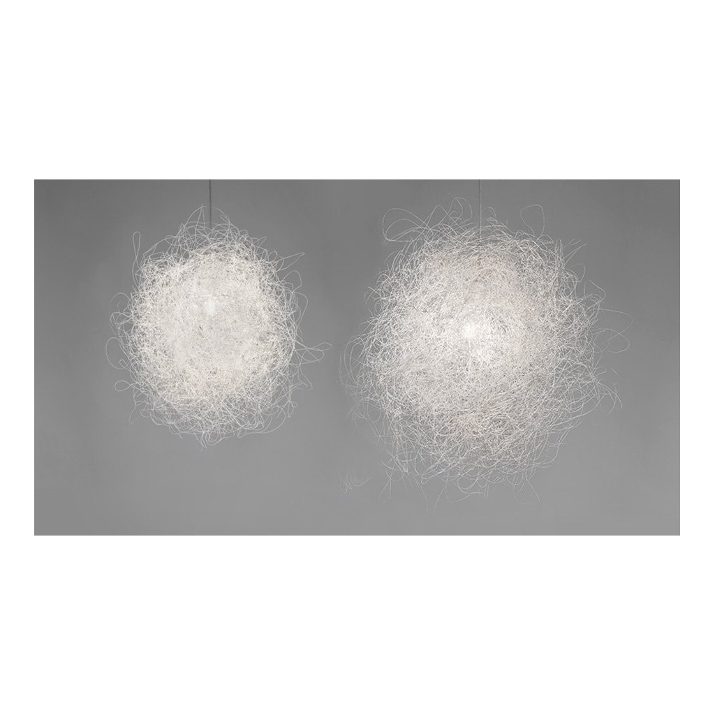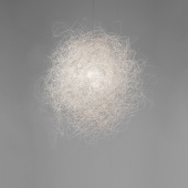 Pili, a single painted stainless steel thread is interwoven, creating random volumes and a harmonious wrapping irregularity, full of charm and mystery, through which the whimsical light escapes. It is available in two sizes, which allows for visually stunning compositions when several units are combined.