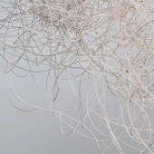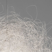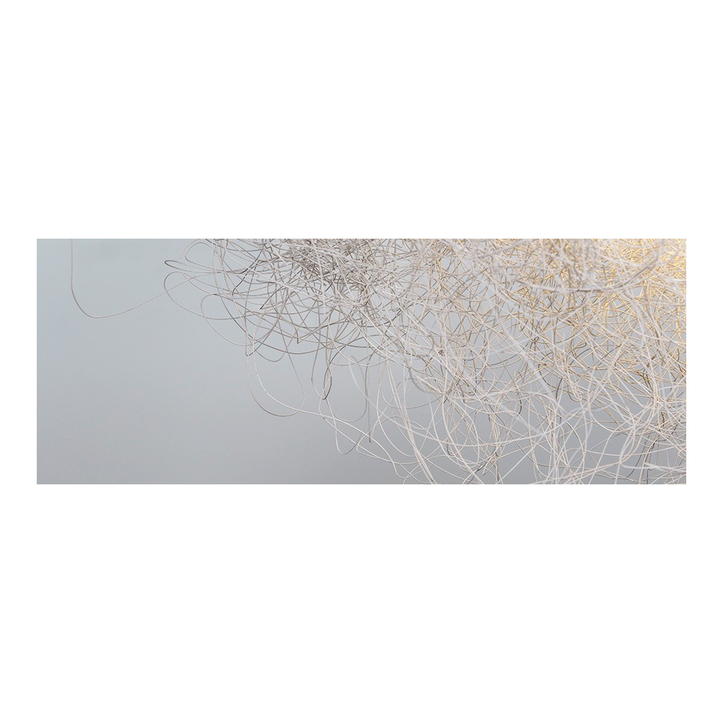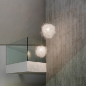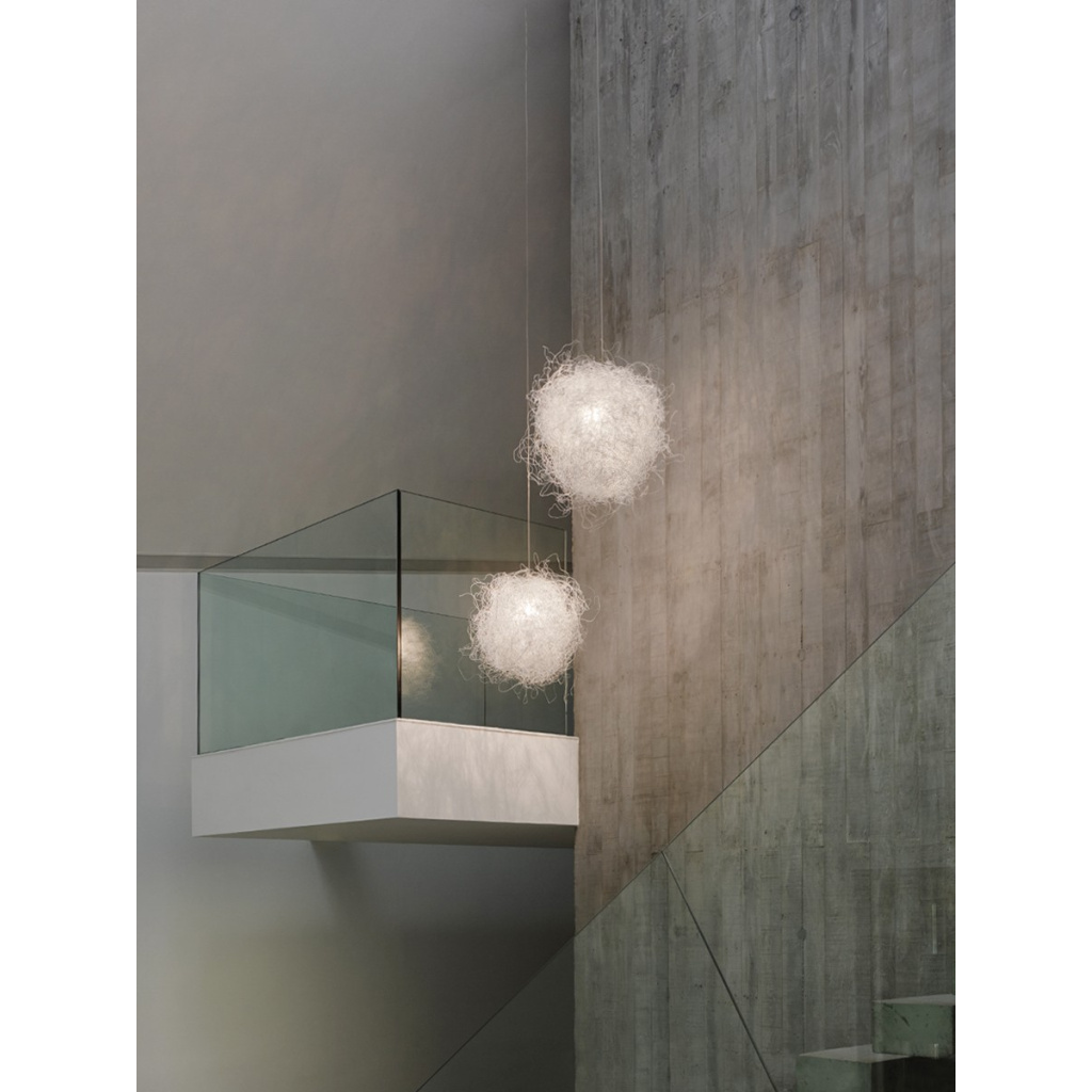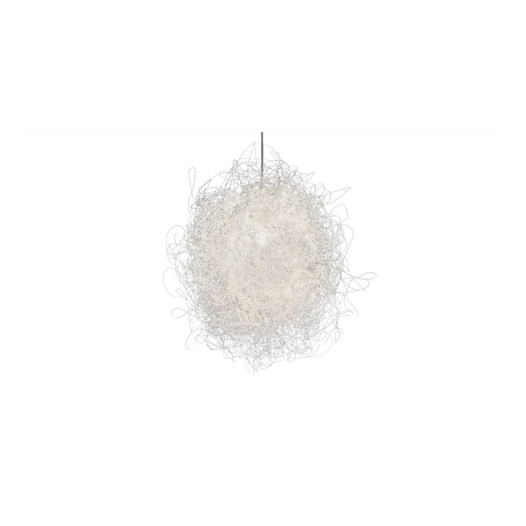 Pili, a single painted stainless steel thread is interwoven, creating random volumes and a harmonious wrapping irregularity, full of charm and mystery, through which the whimsical light escapes. It is available in two sizes, which allows for visually stunning compositions when several units are combined.