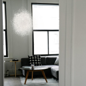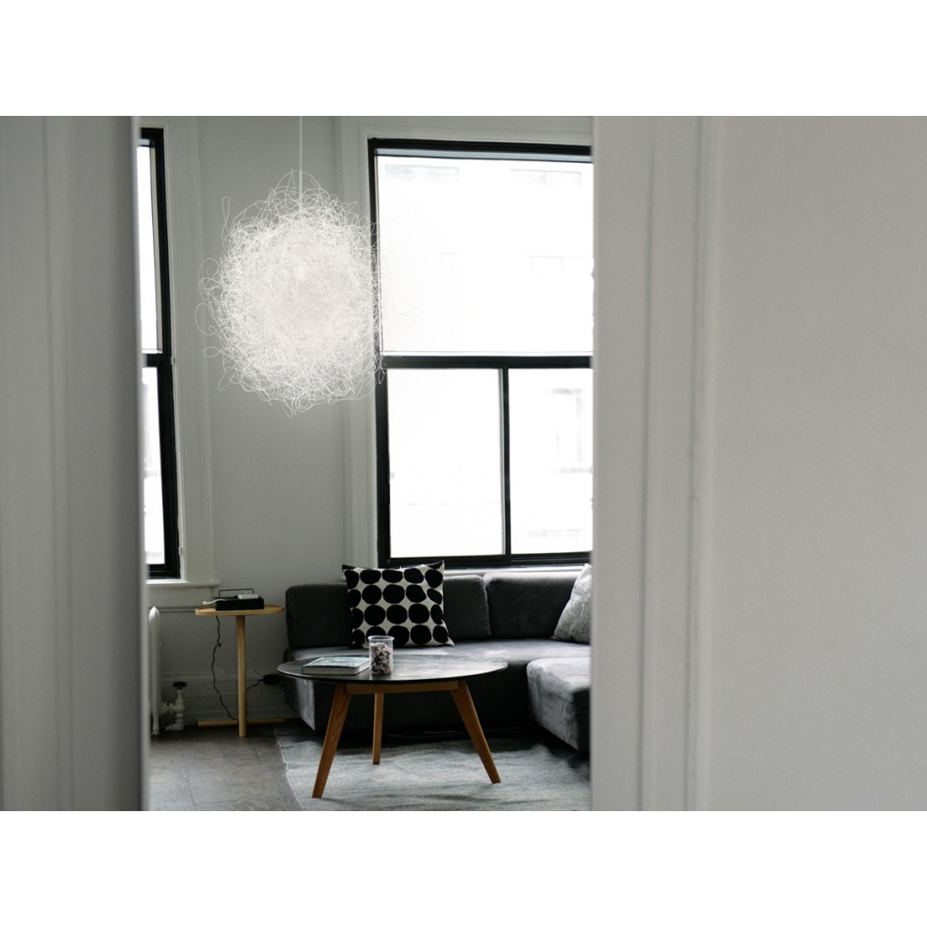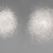 Pili, a single painted stainless steel thread is interwoven, creating random volumes and a harmonious wrapping irregularity, full of charm and mystery, through which the whimsical light escapes. It is available in two sizes, which allows for visually stunning compositions when several units are combined. Designer: Arturo Álvarez.
