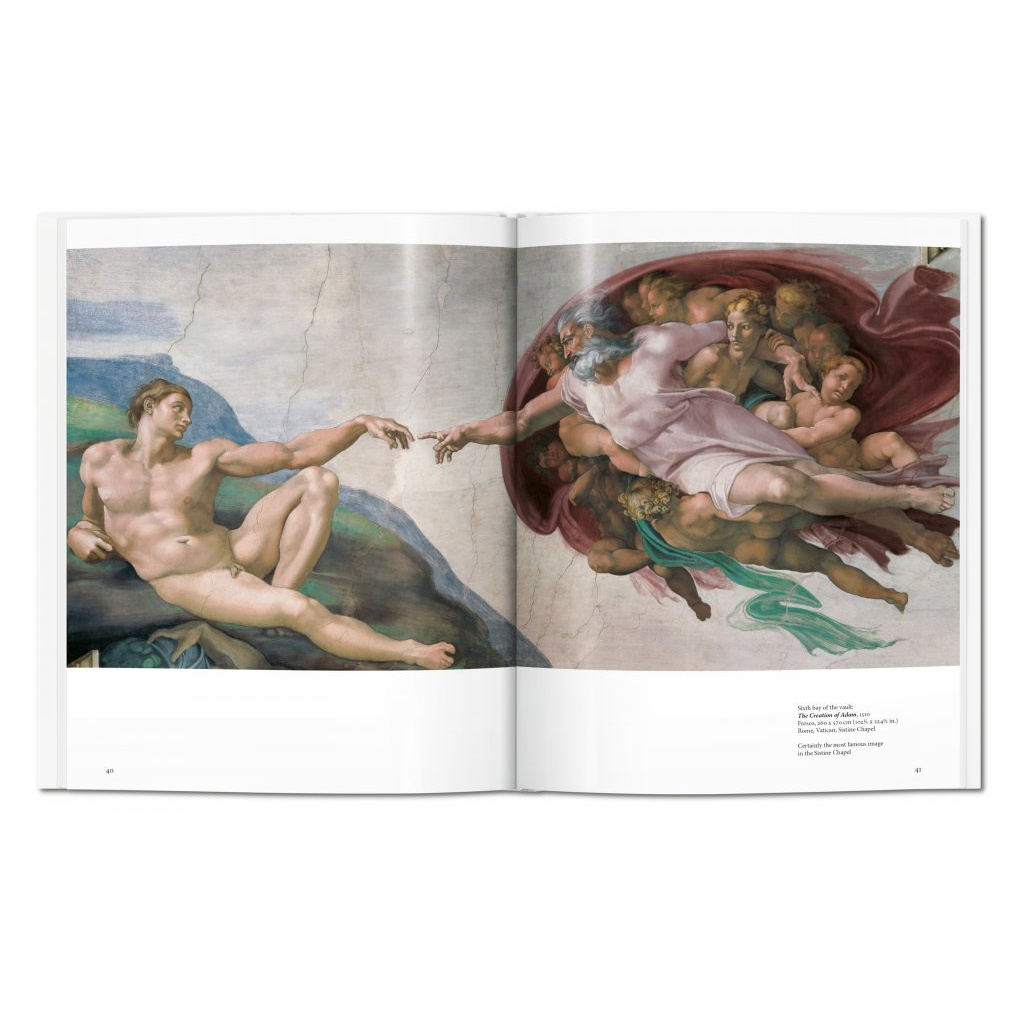 Italian-born Michelangelo di Lodovico Buonarroti Simoni (1475–1564) was a tormented, prodigiously talented, and God-fearing Renaissance man. His manifold achievements in painting, sculpture, architecture, poetry, and engineering combined body, spirit, and God into visionary masterpieces that changed art history forever. Famed biographer Giorgio Vasari considered him the pinnacle of Renaissance achievement. His peers called him simply “Il Divino” (“the divine one”).This book provides the essential introduction to Michelangelo with all the awe-inspiring masterpieces and none of the queues and crowds. With vivid illustration and accessible texts, we explore the artist’s extraordinary figuration and celebrated style of terribilità (momentous grandeur), which allowed human and biblical drama to exist in compelling scale and fervor. Through the power hubs of Renaissance Italy, we take in his major commissions and phenomenal capacity for compositional schemes, whether the famous Medici library in Florence, or the extraordinary 500-square-meter ceiling (1508–1512) in the Vatican’s Sistine Chapel.