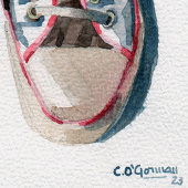 The classic silhouette of a pair of shoes become the hero in The Sneakers by Buenos Aires based artist Camila O’Gorman. A level of depth and detail is created through layering of water colour paint, as the neutral tones of the composition are offset by the striking red trim that give the shoes their silhouette.