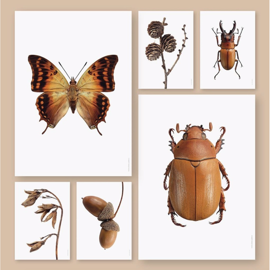 You can choose between two versions of each design. When choosing No tinted background, no name it becomes a greater contrast between the motif and the background, a more graphic look. When choosing Tinted background and name the contrast is a little softer, and you get a white border around it like a built in passepartout, a more classic look. If you choose the tinted background you will also get the species scientific name printed under the insect.