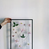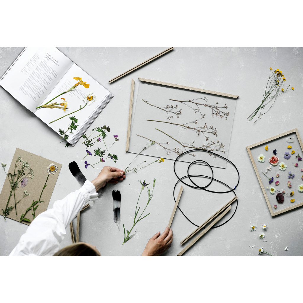 FRAME consists of two pieces of acrylic glass, four lists made of either oak or aluminium and a rubber band.