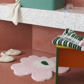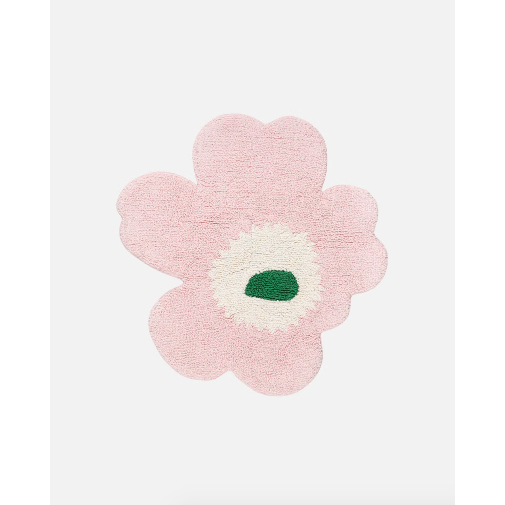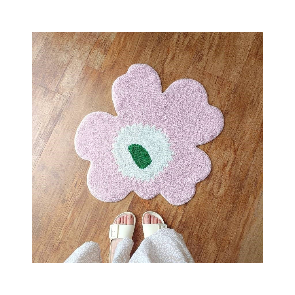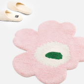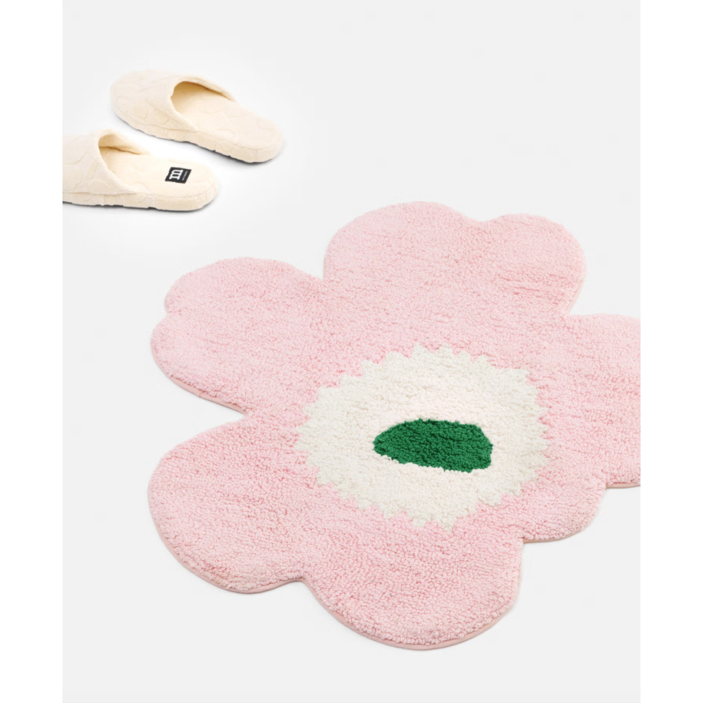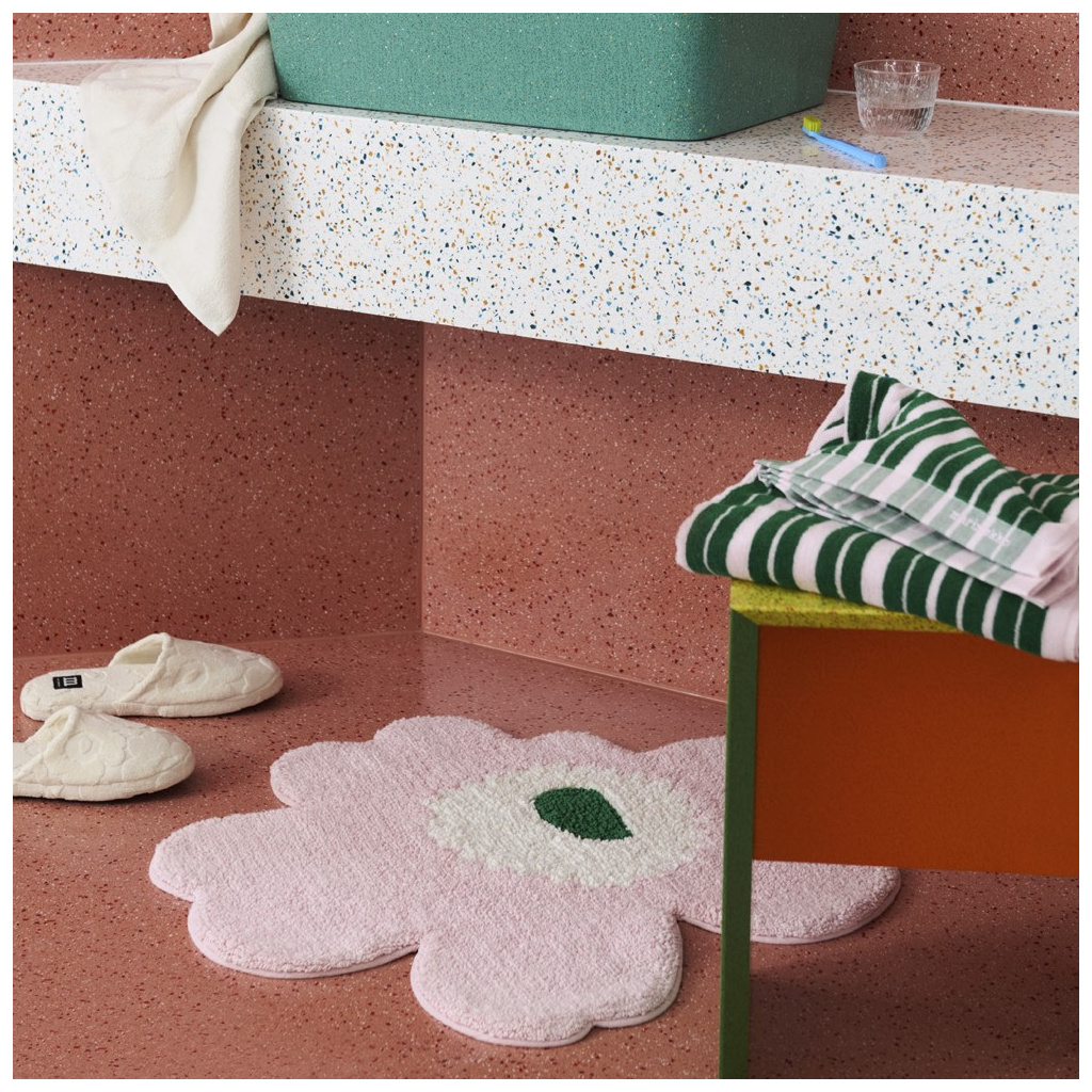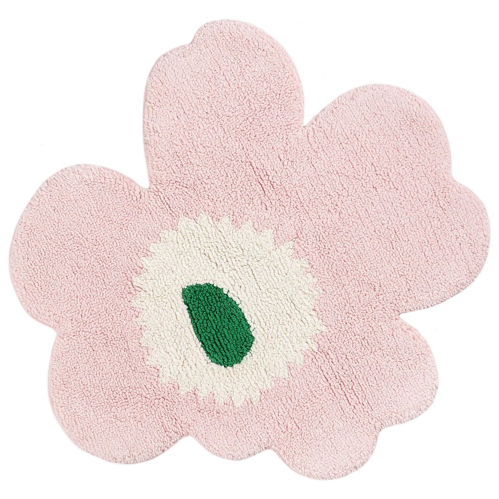 The Unikko flower shaped tufted bath mat is made of organic cotton. The soft tufted surface and hand-cut shape give every bath mat a unique appearance, so small differences between products may appear. The bath mat has a non-slip backing.