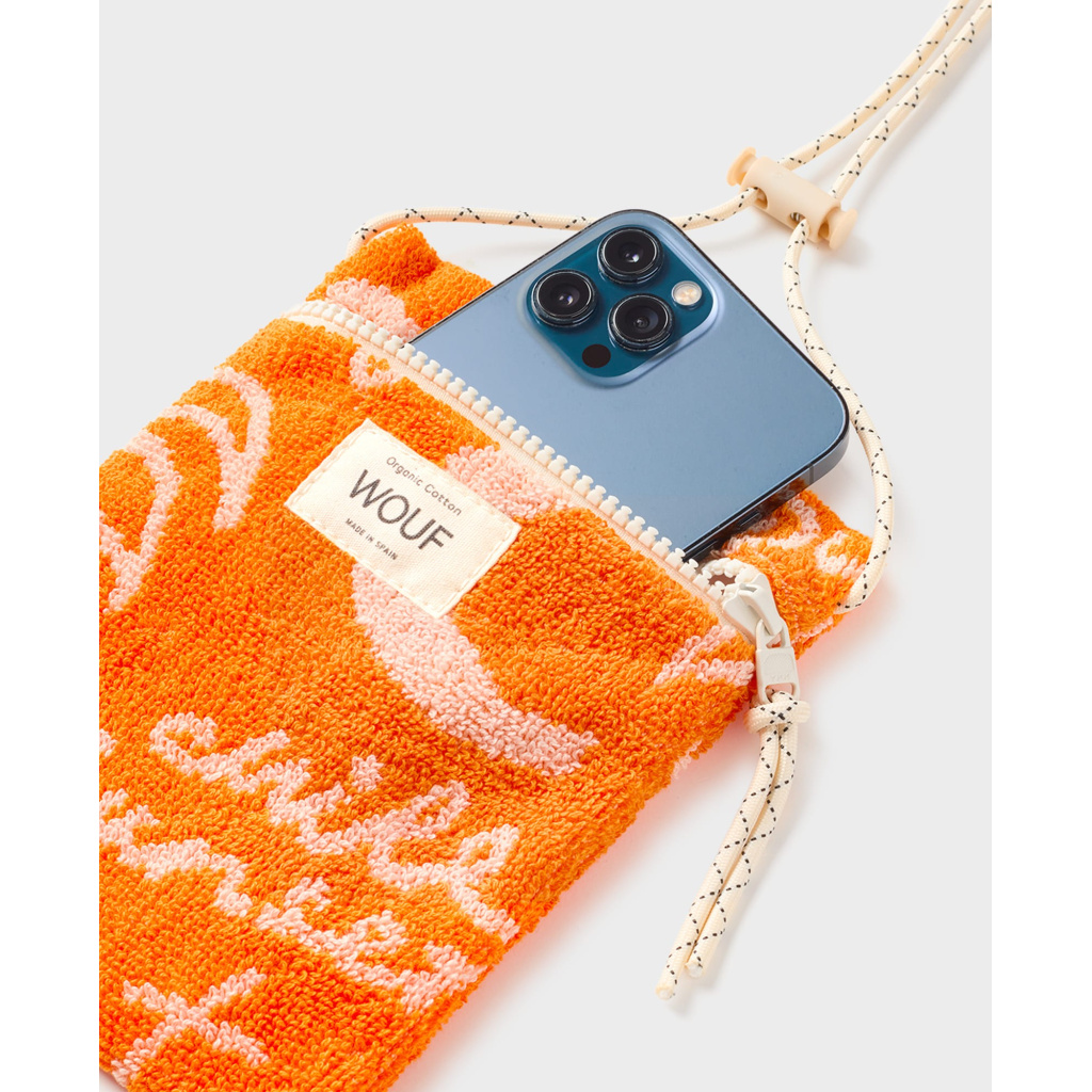This terry-cloth phone bag is made of 100% organic cotton. It features a water-repellent lining and an adjustable cord long enough to wear cross-body.
