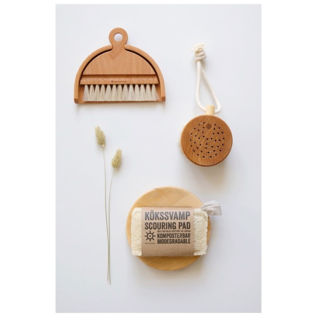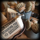 Clean the scouring pad by placing it in boiling water with mild washing-up liquid. Rinse it and let it air dry, use the handle. If it changes colour or becomes too soft, it is time to put it on the compost.
