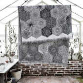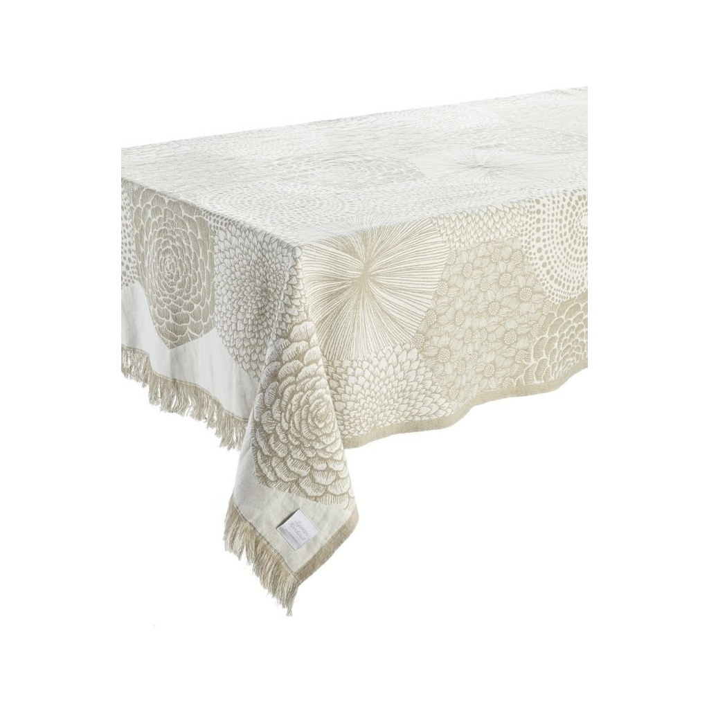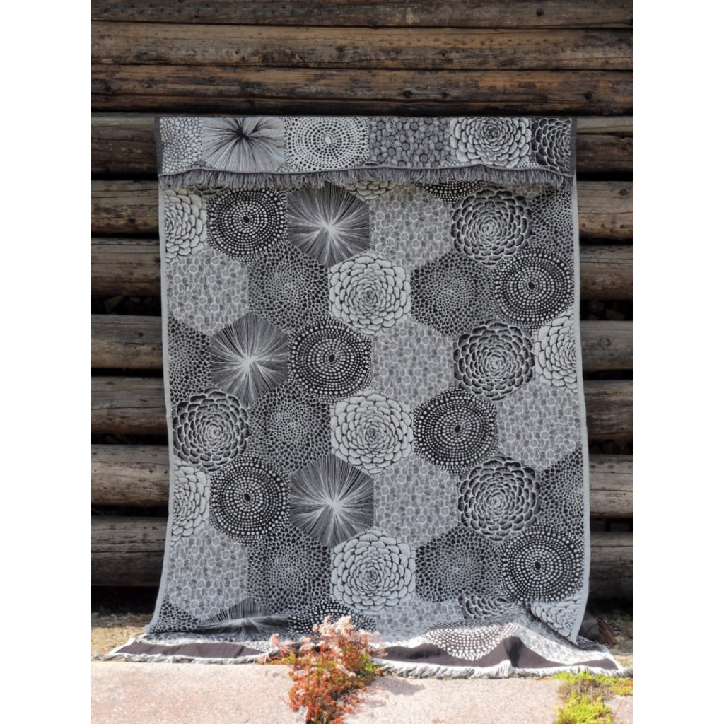 Obrus-Narzuta lniana RUUT 140x240 Biało-Lniany. Heini's beloved RUUT designs parallel her ceramic works with the same hexagon forms she uses which are also found in the ceramic works throughout the Arabianranta courtyard.