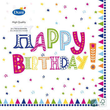 DUNI SERWETKI 3 WARSTWOWE 33X33CM HAPPY BIRTHDAY 20SZT. Serwetki tissue są uniwersalne i ekonomiczne, miłe w dotyku. Idealne do użytku na co dzień.