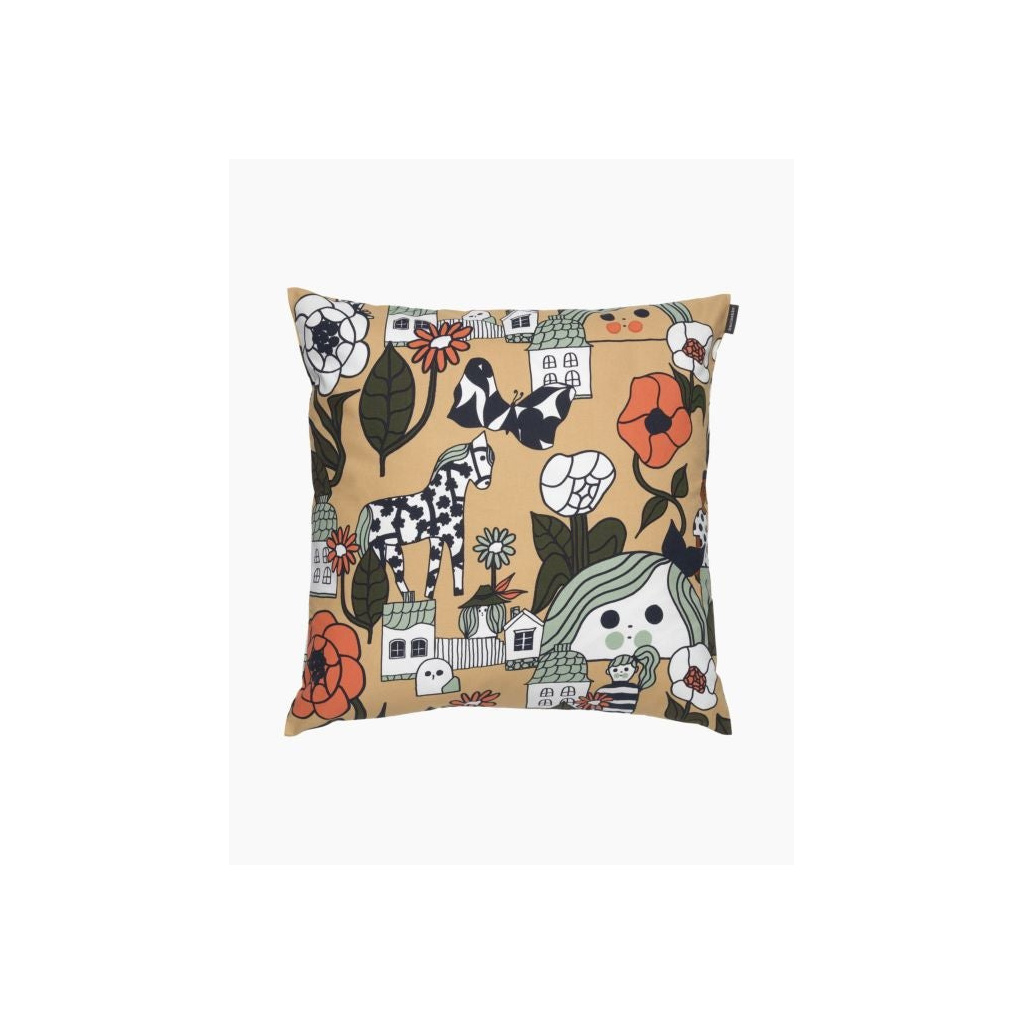 The Marimekko Marikylä cushion cover is adorned with a pattern that leads you to a village of happiness and love, where you can meet a happy horse lounging on a flower meadow or enjoy being together with your best friends. Designed by Jenni Tuominen, the Marikylä (“Mari village”) print represents love, caring and the right to be who you are.