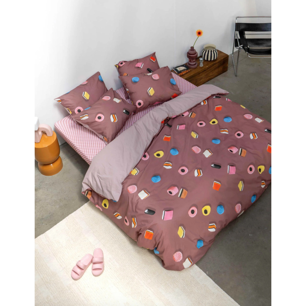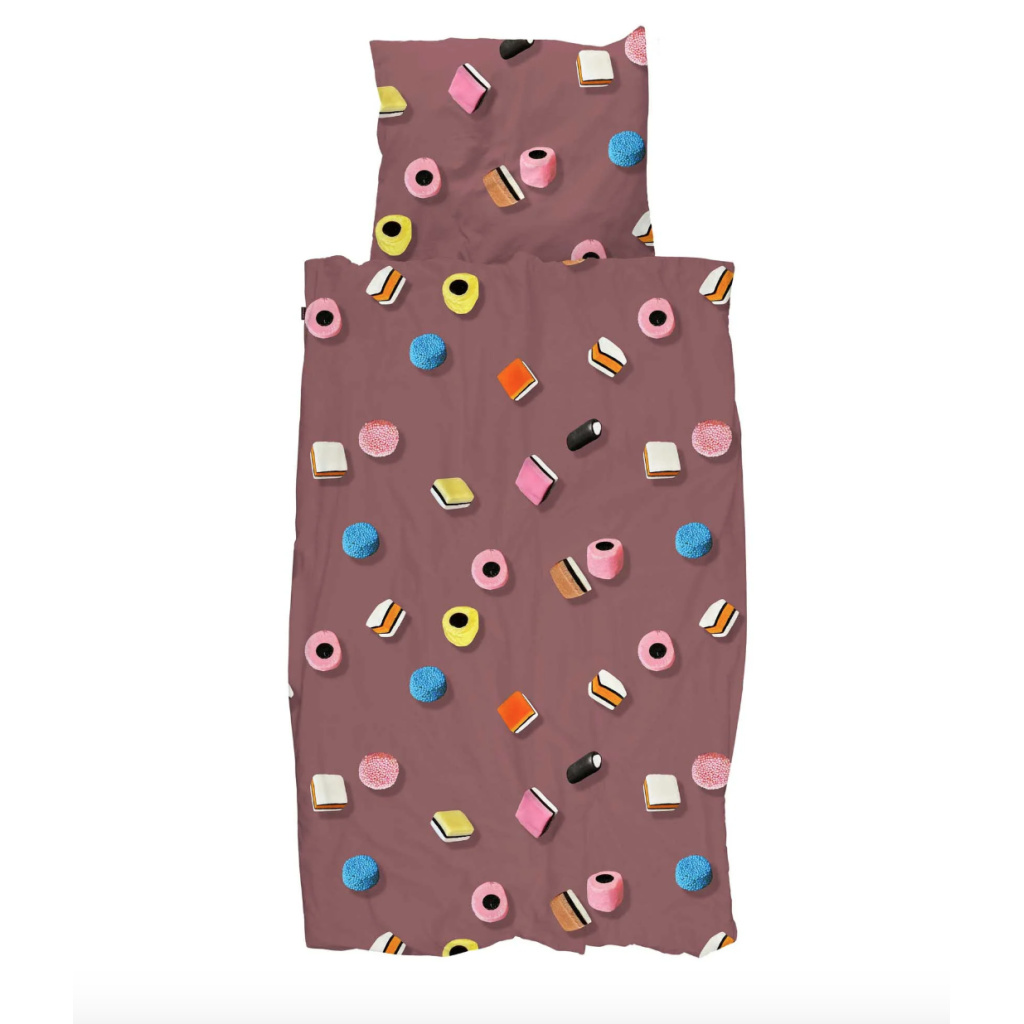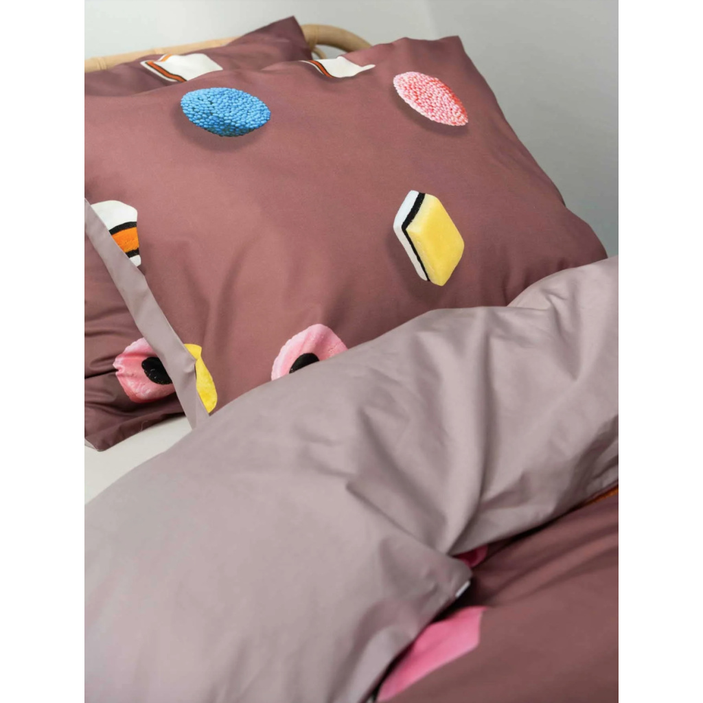A print full of flying English liquorice sweets on a trendy mauve background. Colourful, quirky and slightly nostalgic, as if someone had tipped a candy jar onto your duvet (but in a stylish way). This special liquorice was added halfway through the season because we couldn't resist it. Please note: stocks of this liquorice are limited. Will you grab one before they're all gone?