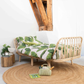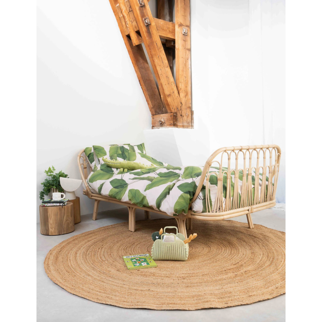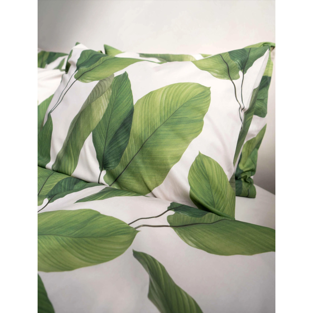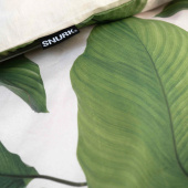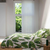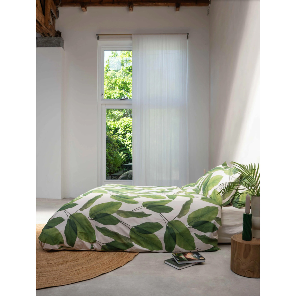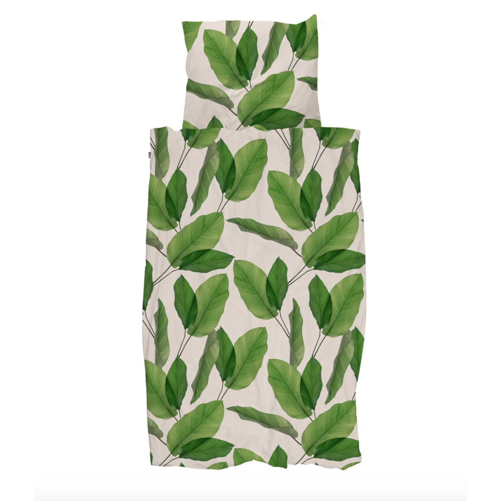 Large green leaves fan out across a beige background. Calming, natural, yet distinctive. Made from soft organic cotton, breathable and timelessly beautiful. Leaf me in bed. Preferably for as long as possible.