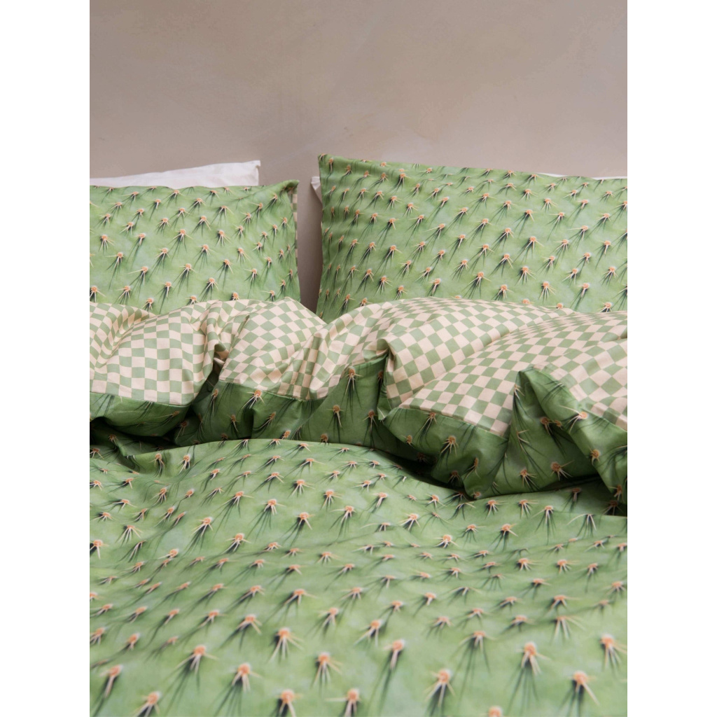 Duvet cover set with an all-over cacti print with a soft green on soft yellow checkered pattern on the reversible side. Made in Portugal from 100% organic cotton.