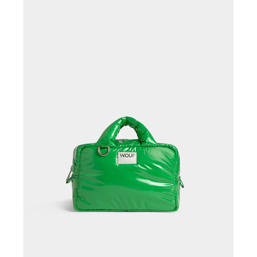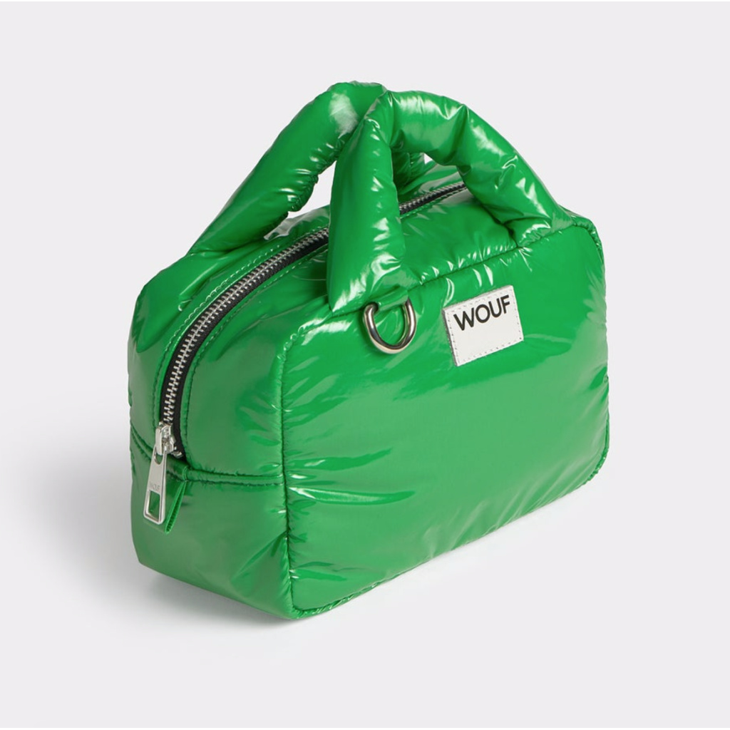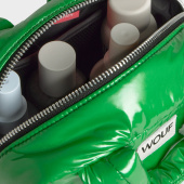 The Basil toiletry bag, made from 100% recycled fabrics, is designed to carry your personal care items with a shiny finish. It features a water-repellent surface, a main zipped compartment, an inner pocket, and two top handles for easy organisation and transport.