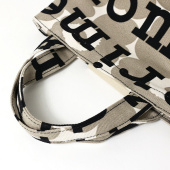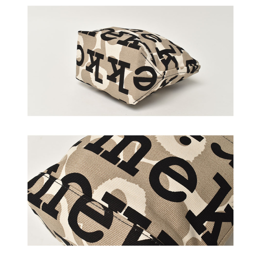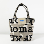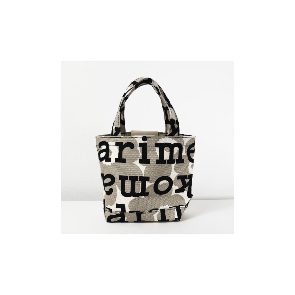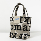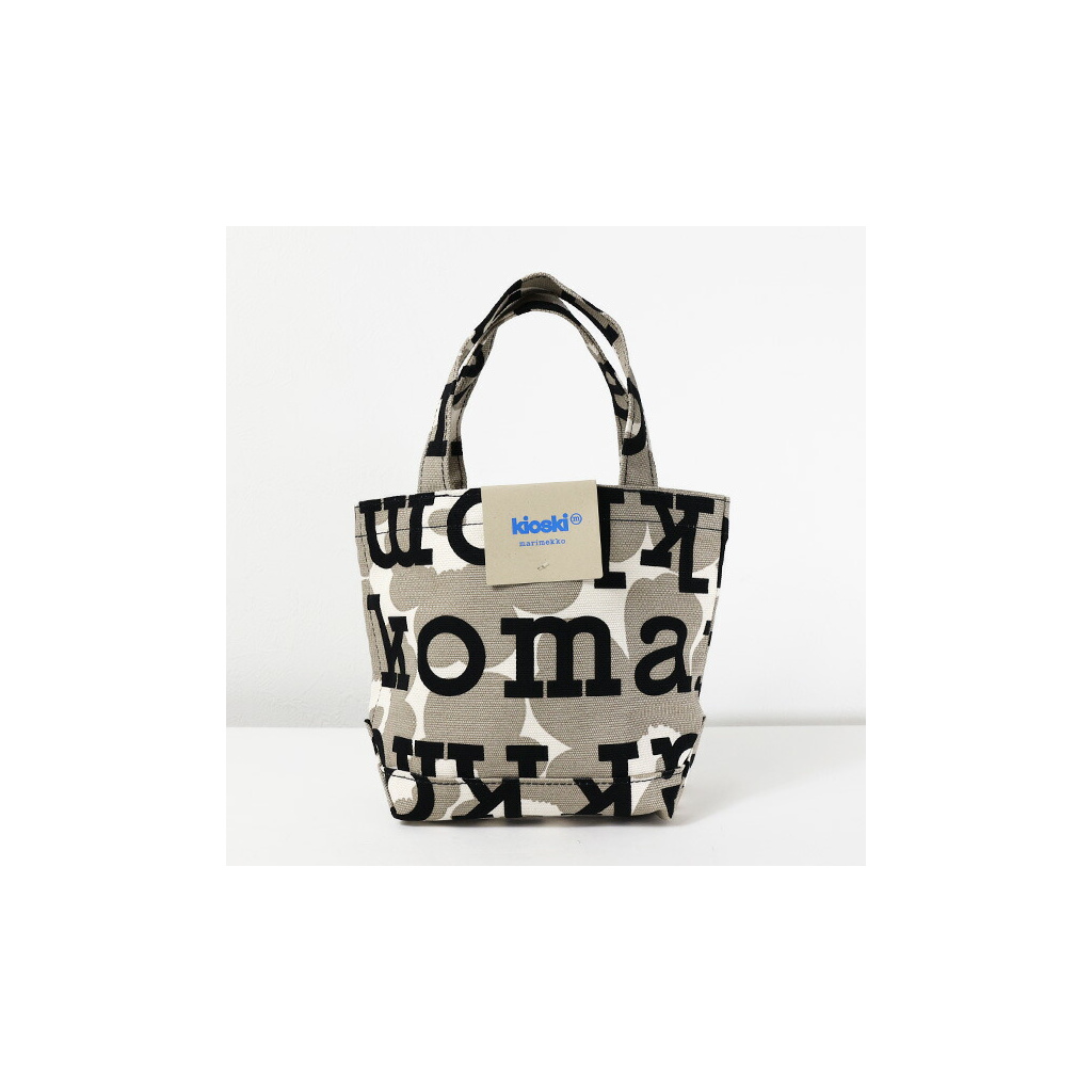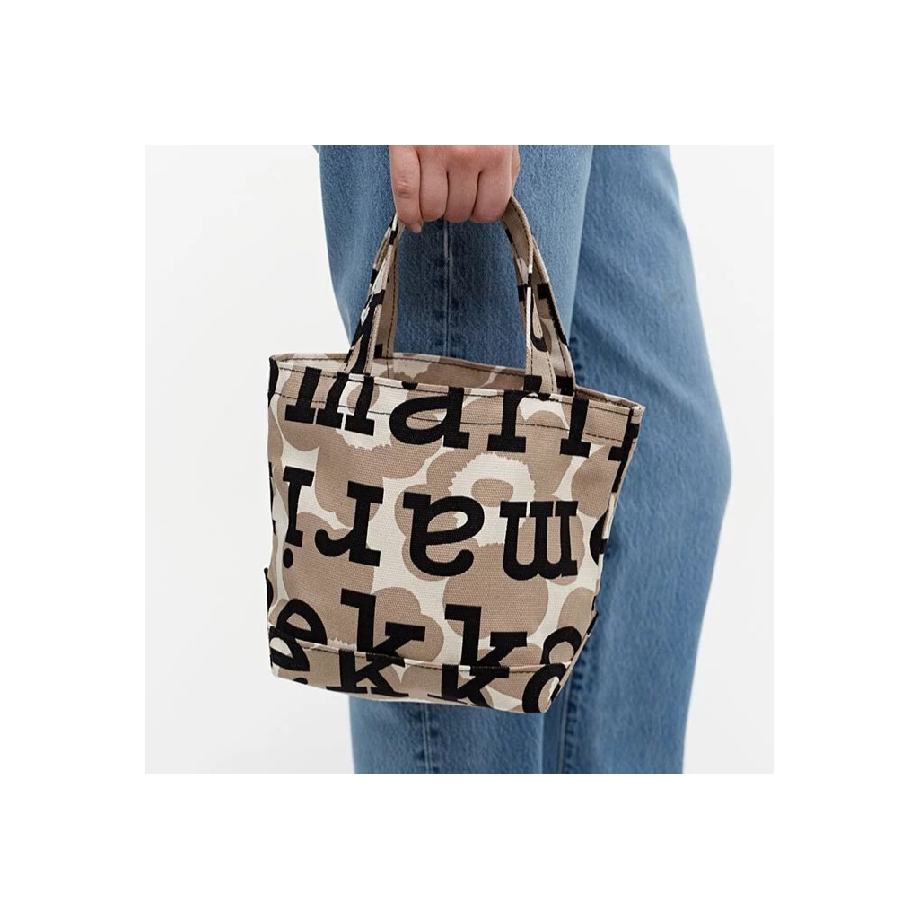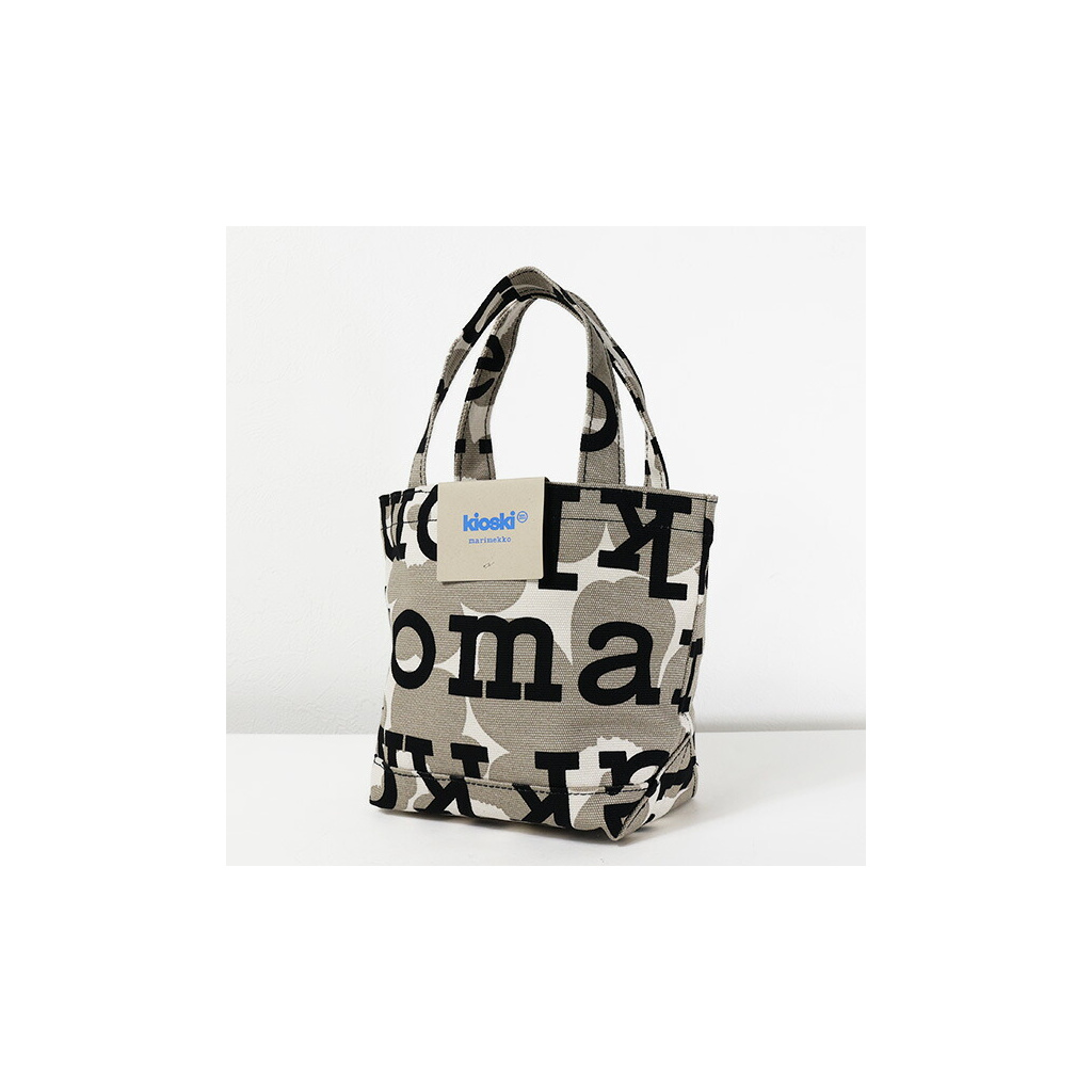 The Pieni Ahkera tote bag is made of lightweight cotton canvas, which features the Logo pattern on top of the Unikko pattern. The small bag has two sturdy handles. Printed in Helsinki.